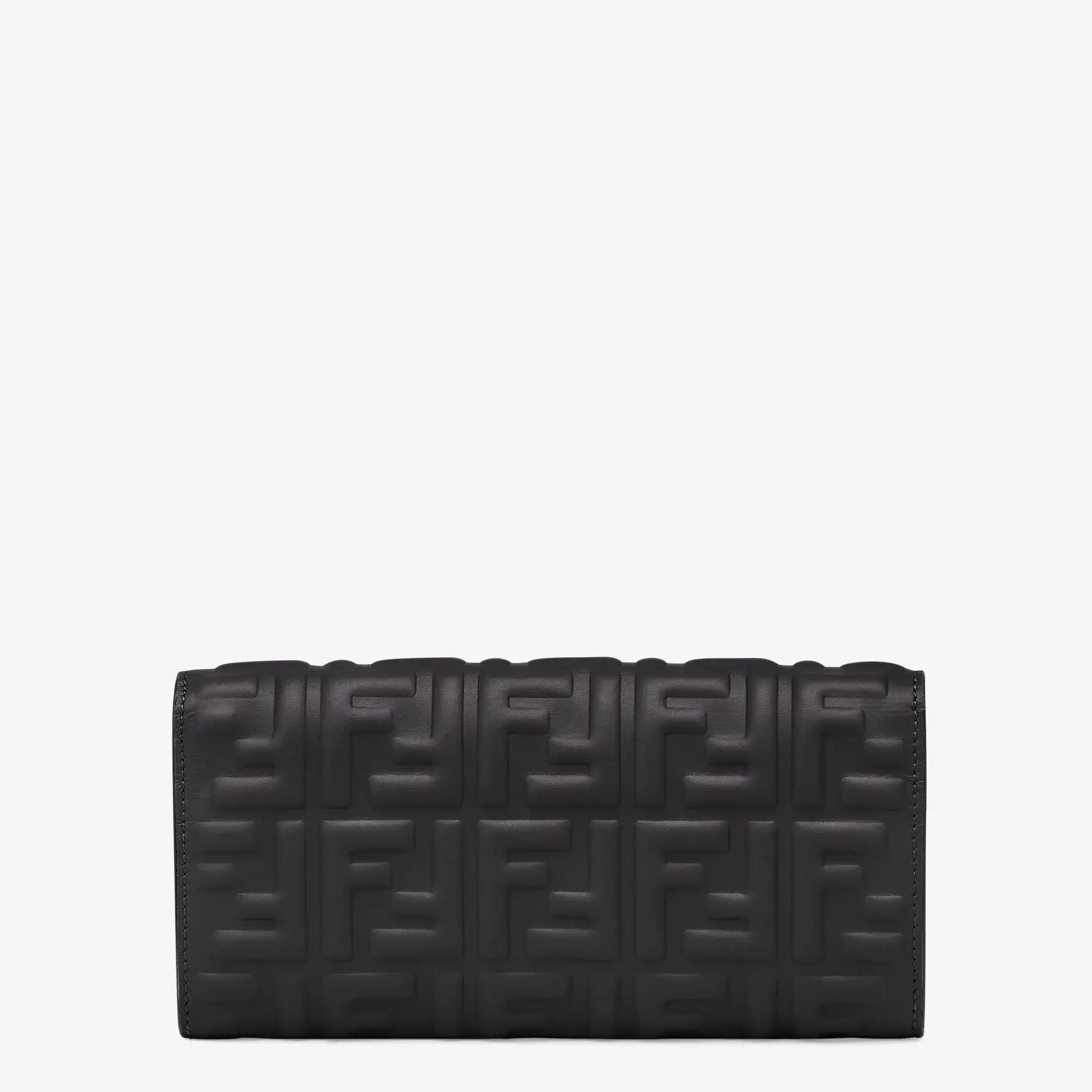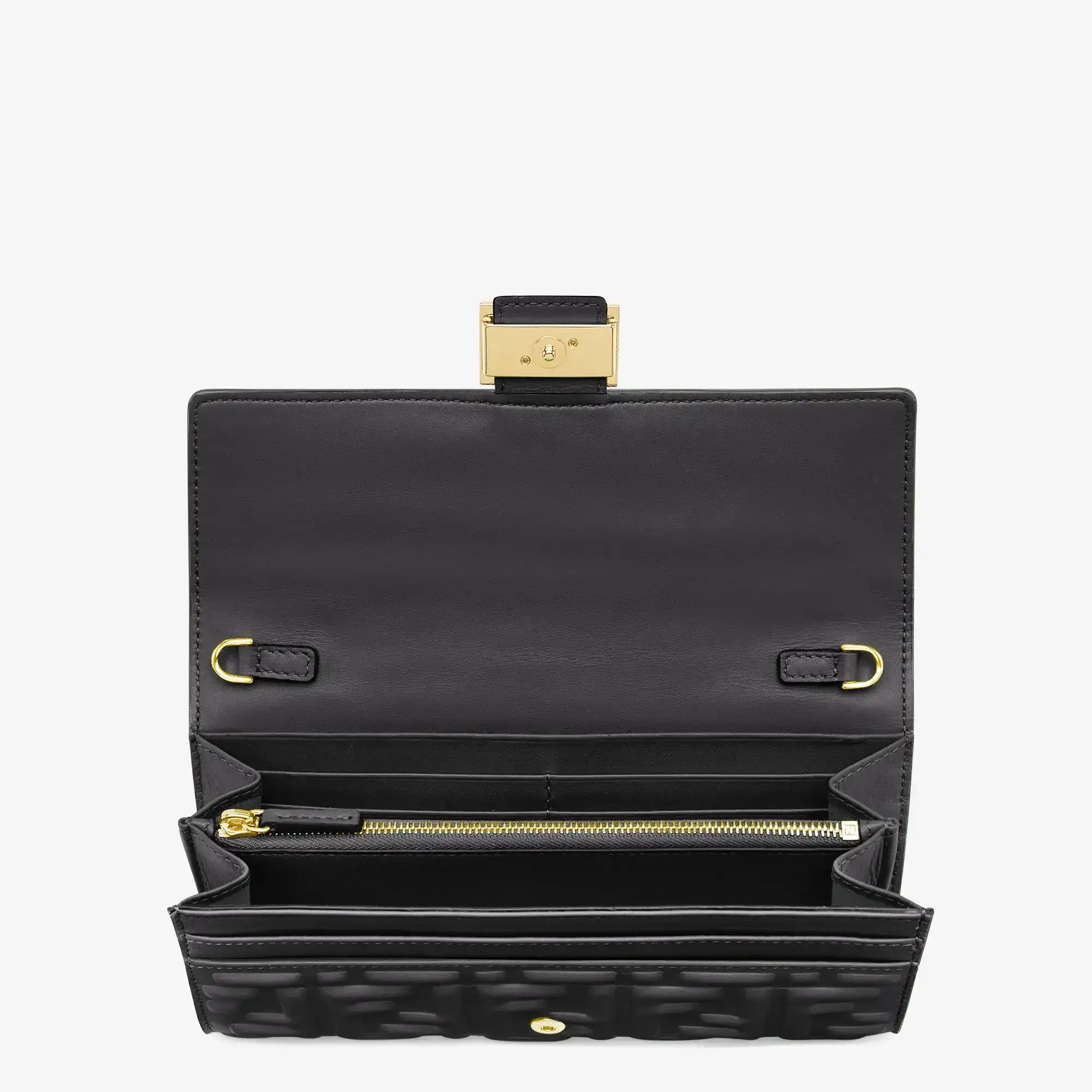 Baguette continental wallet with detachable, thin chain shoulder strap. The interior is laid out like a wallet with two gusseted compartments, a zip pocket, flat pockets and ten card slots. Made of black nappa leather. Finished with embossed FF motif. Gold-finish metalware.Made in China