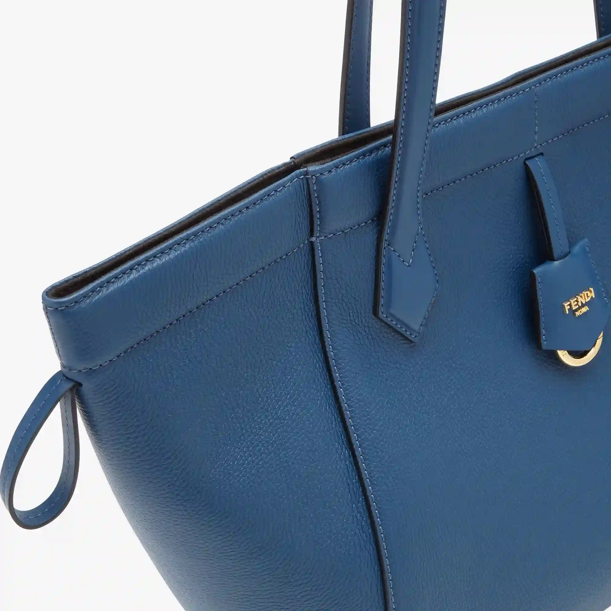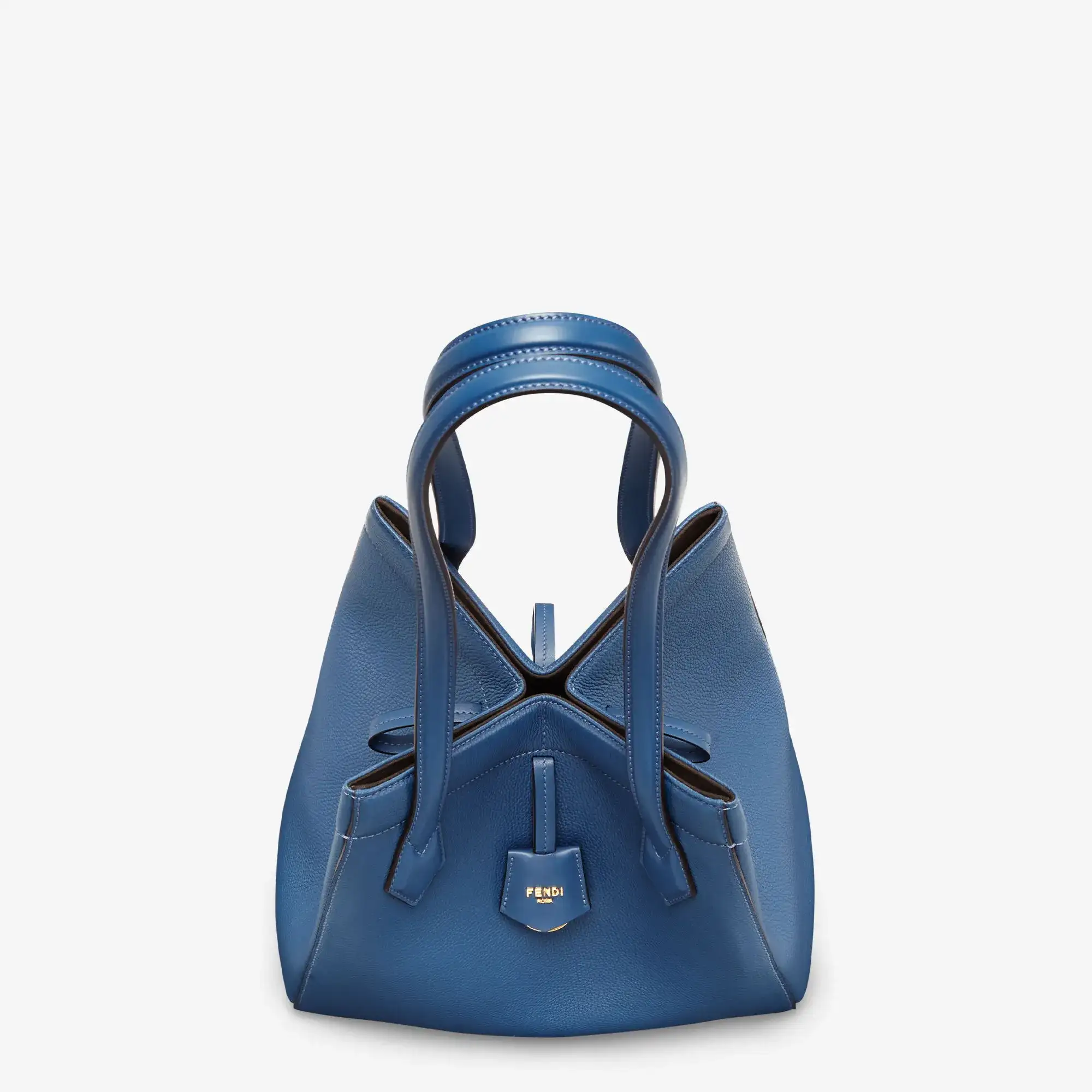 Medium Origami Bag. The style recalls the duality and creativity of Fendi with an innovative and transformable design: the ingenious closure with eight magnets means the bag can be folded, origami-style, transforming it from a bucket bag, when the magnets come together in the middle with a magic clasp, into a shopper by gently pulling the leather ties on the short shoulder straps on each side.Made of blue full-grain leather.It comes with a key case charm with the words “Fendi Roma” in metal. Lined inner compartment and gold-finish metalware.It can be carried by hand or worn on the shoulder thanks to the two calfskin handles.Made in China