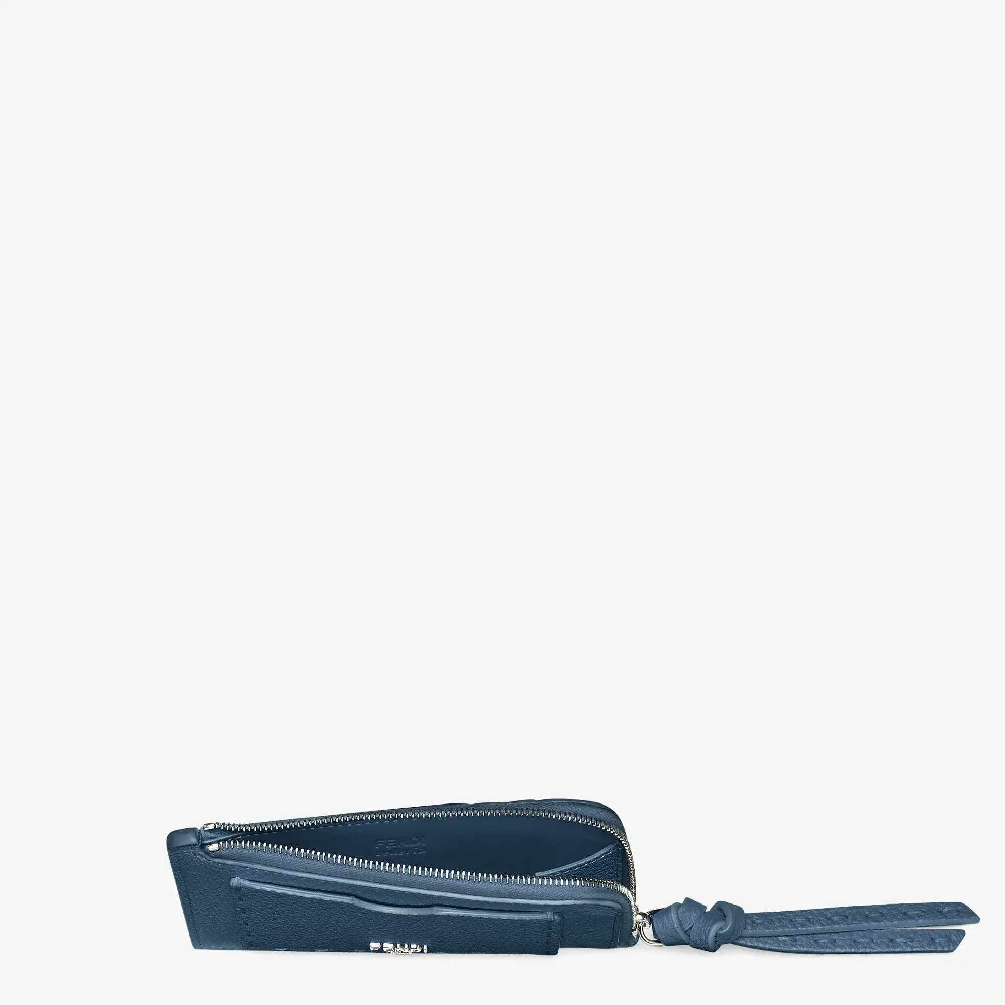 Peekaboo card holder with four back card slots, a central zip compartment and front card holder. Made of blue Cuoio Romano leather and finished with 62 hand-sewn tone-on-tone macro topstitches, an emblem of the iconic Selleria workmanship handed down through generations of Fendi artisans since 1925. Palladium-finish metalware and metal FENDI logo.Made in China