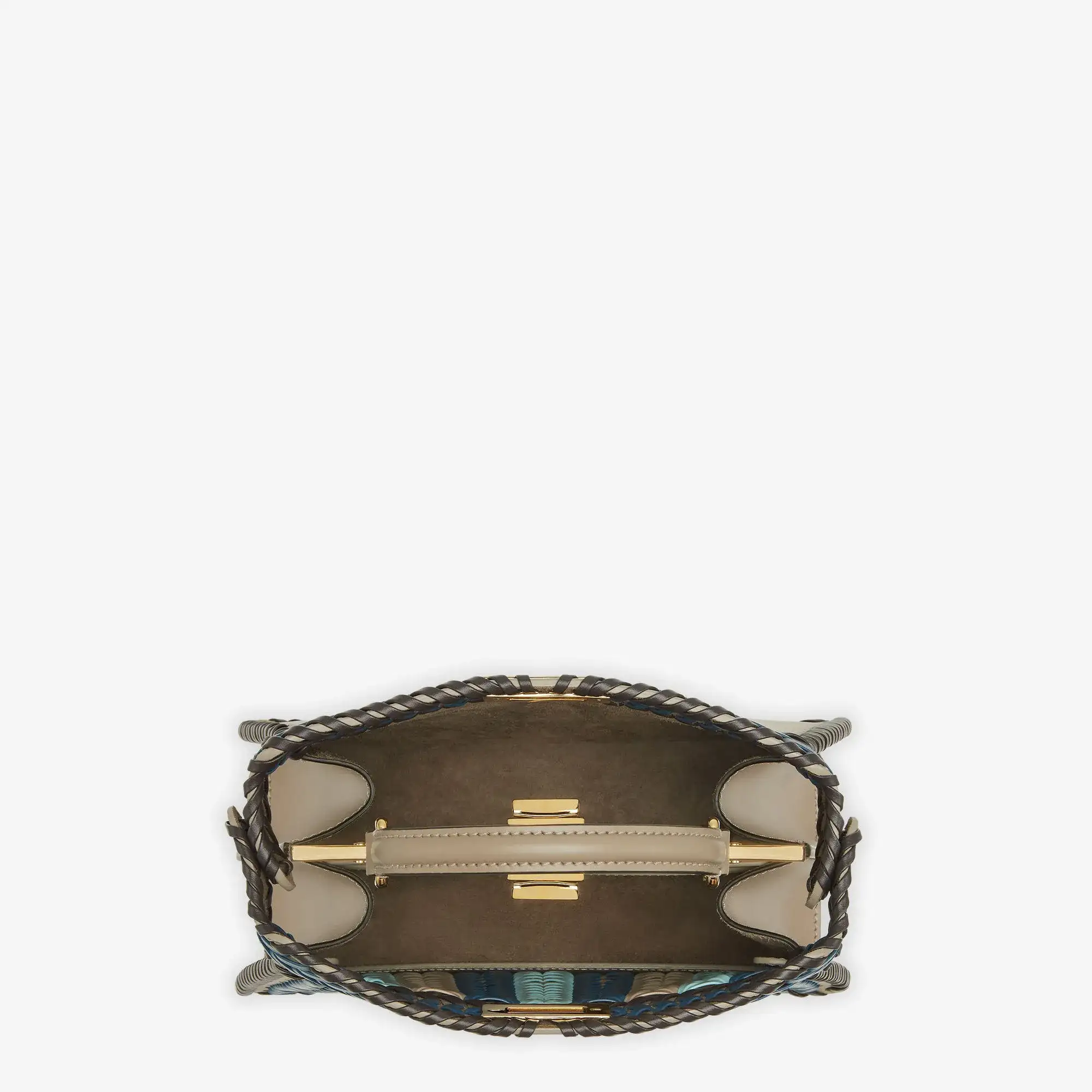 Iconic small Peekaboo ISeeU bag, the epitome of Fendi craftsmanship and creativity. A timeless icon, the Peekaboo was created in 2009. Like the children’s game it takes its name from, peek-a-boo, the bag plays with the beauty showcased on the outside and that concealed on the inside.Made of dove grey calfskin, embellished with hand-crafted multicolour interlacing in blue, light blue and dove grey leather.Featuring an unlined interior, two internal compartments divided by a stiff dove grey calfskin partition, internal pocket. Gold-finish bar, closure and metalware.Decorated with the iconic twist lock on both sides.The bag can be carried by hand or worn either on the shoulder or cross-body thanks to the handle and adjustable, detachable shoulder strap.Made in China