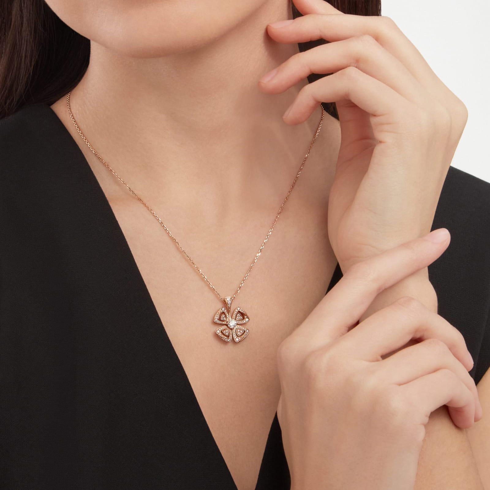 Blooming amongst the marvels of the Eternal City, Fiorever draws inspiration from the alluring four-petal flower cherished by the Romans as a symbol of happiness and joy. The blend of two meaningful words, Fiore, Italian for flower, and forever, Fiorever celebrates the Roman love for life with a striking, passionate design. Meant to sparkle with an eternal glow, Bvlgari’s precious floral icon is crafted with a central diamond embraced by four rose gold open-worked petals shimmering with pave diamonds. Fiorever necklace in 18 kt rose gold with a diamond and pave diamonds.