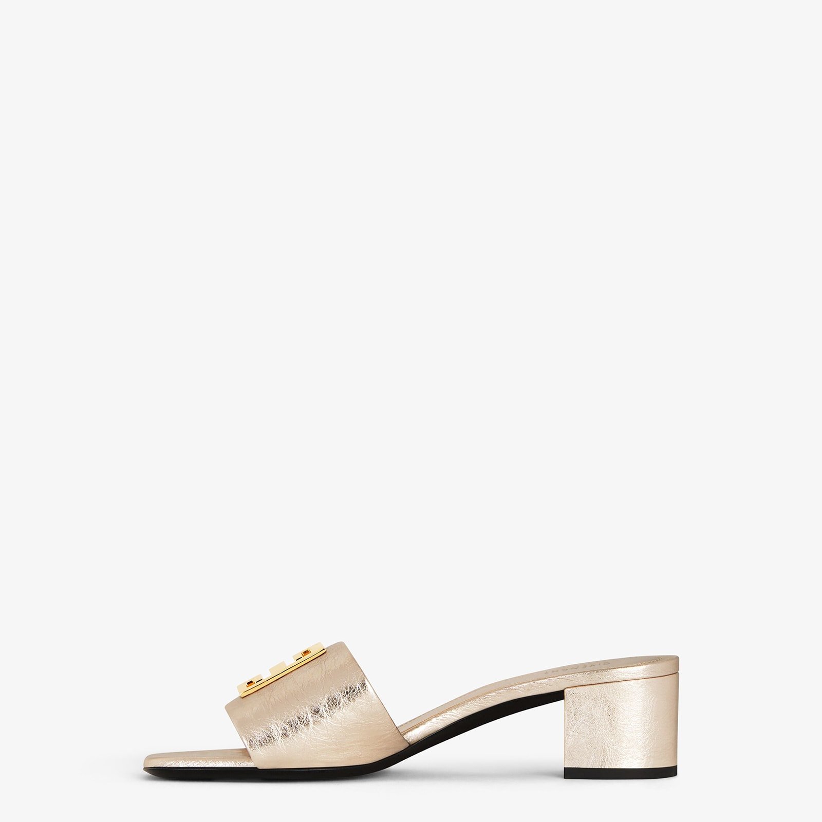 Mules in laminated calfskin leather with golden-finish 4G metal piece on top.