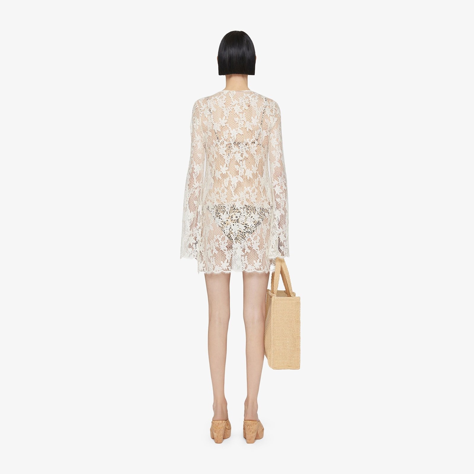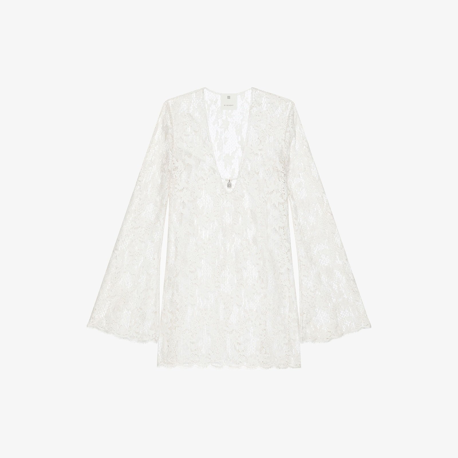 Short dress with long sleeves in transparent lace.