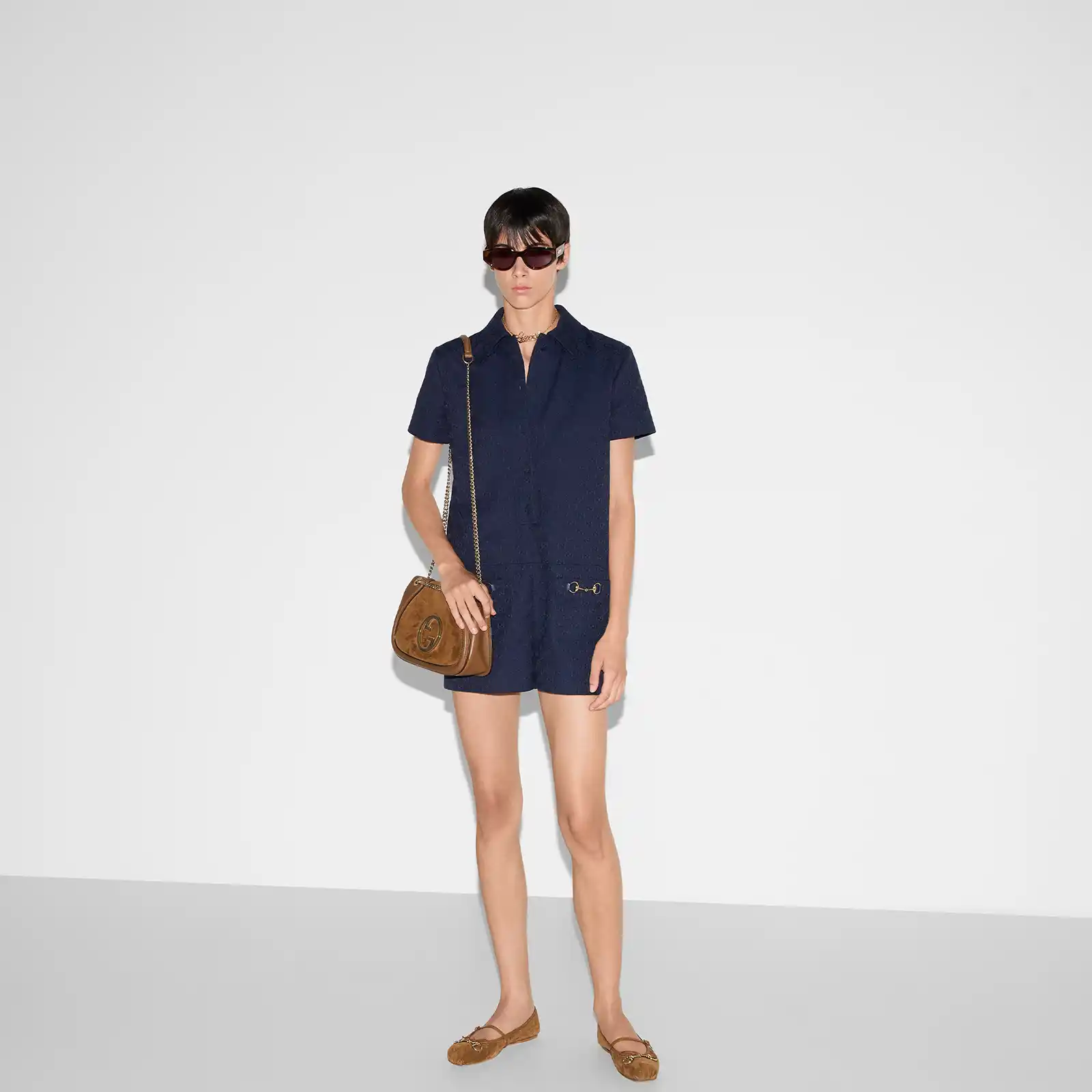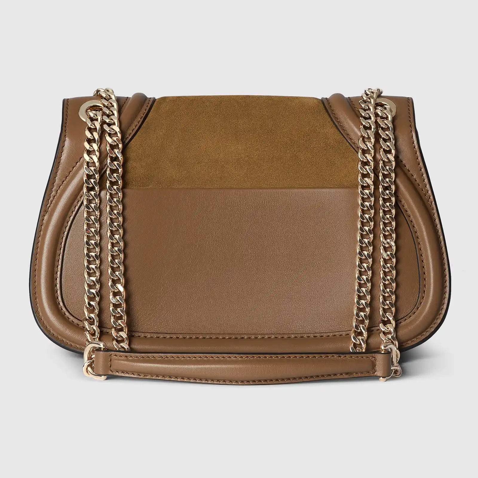 The new Gucci Blondie bag, whose distinctive logo first appeared in the House’s collections in the early 1970s, weaves together past and present in a fusion of nostalgia and modernity. This small shoulder bag is crafted from brown suede, featuring the House’s round symbol in enamel. The gold-toned chain and leather strap can be worn on the shoulder or crossbody.