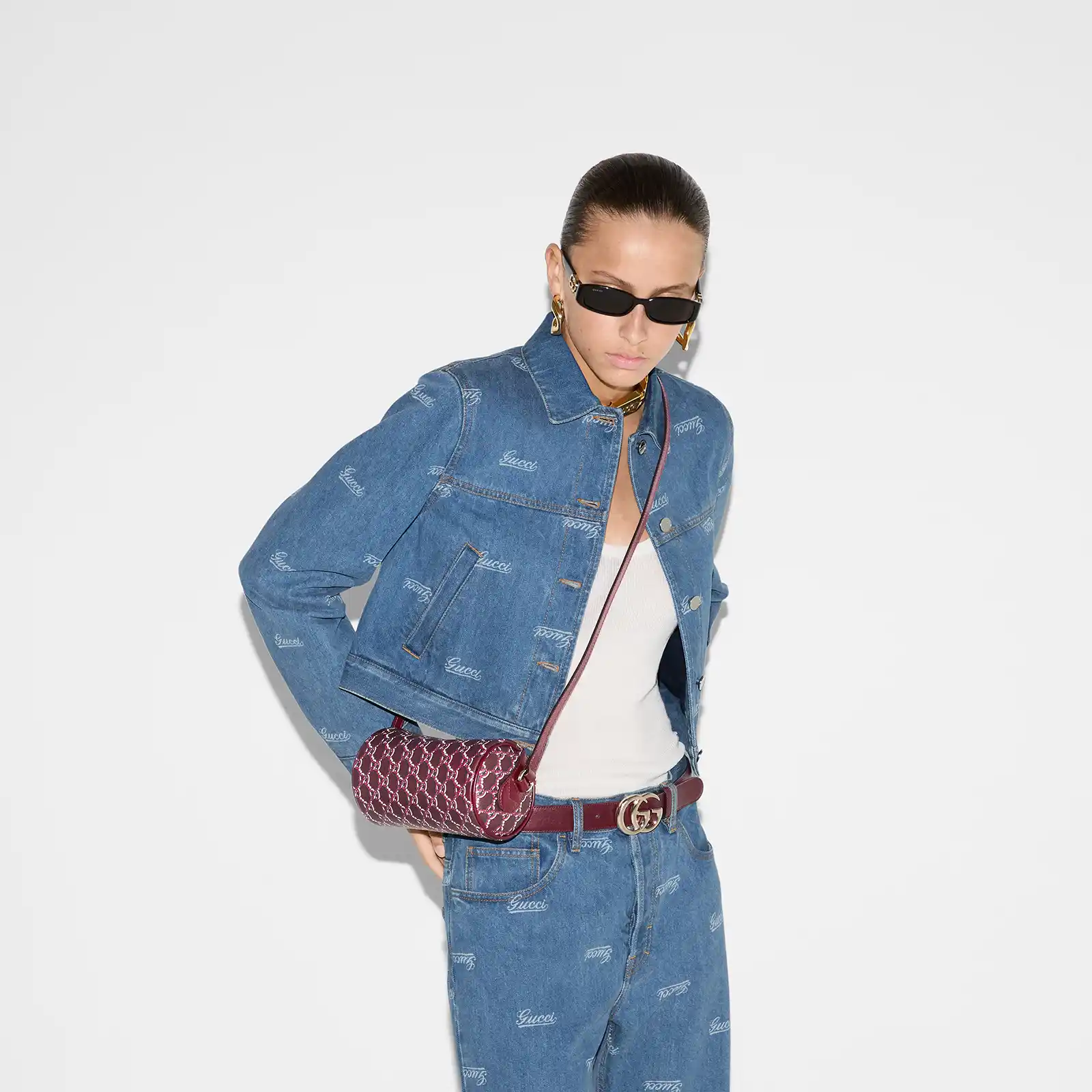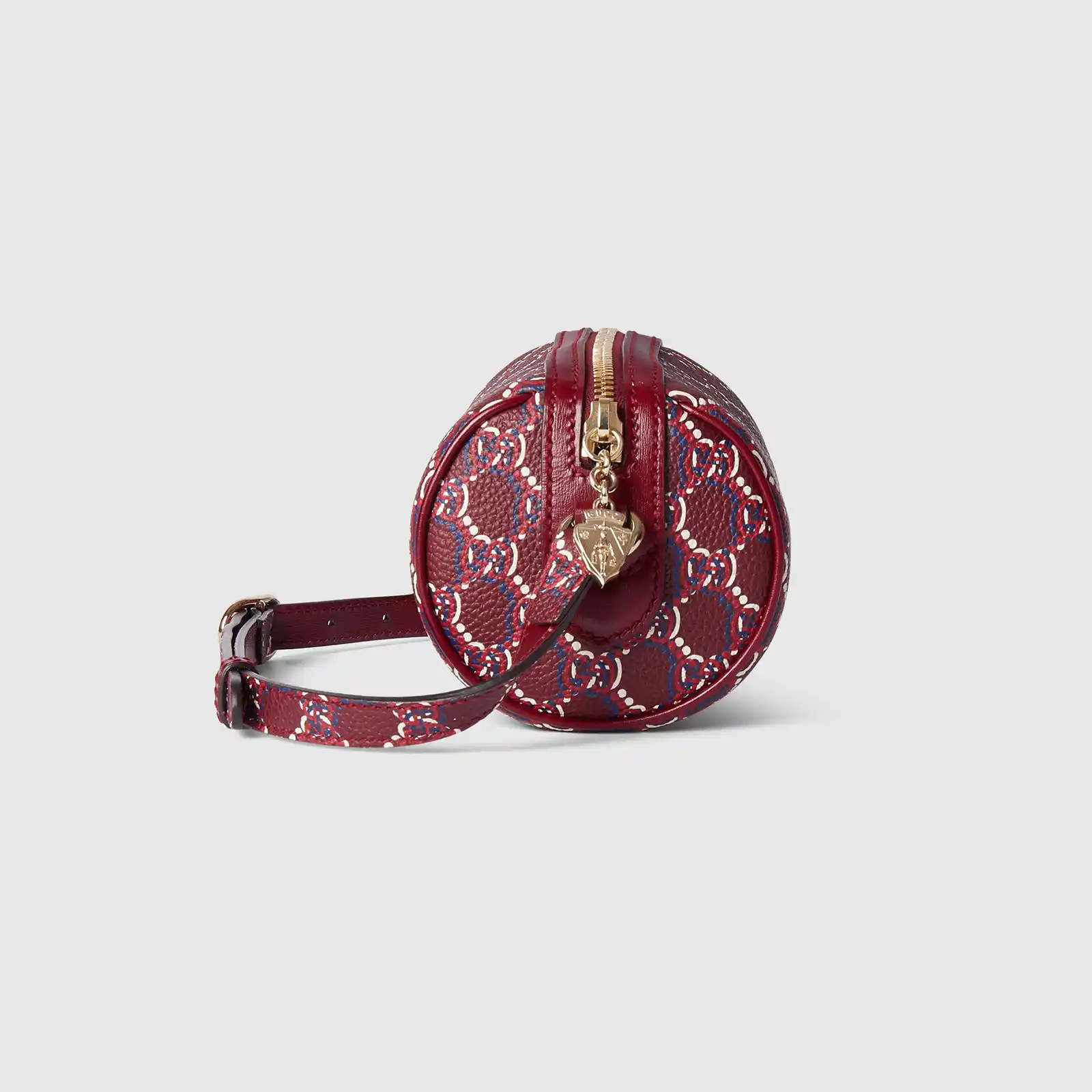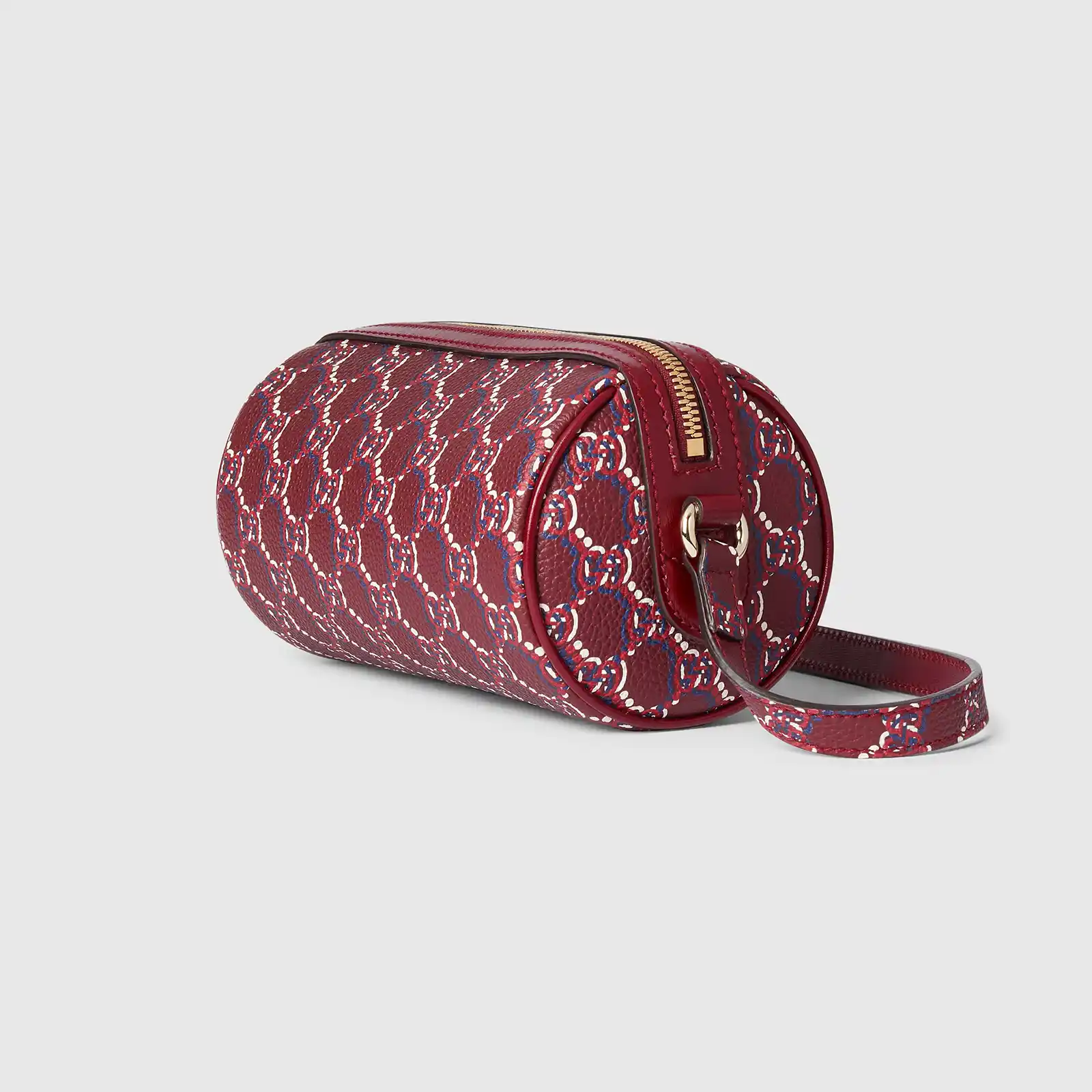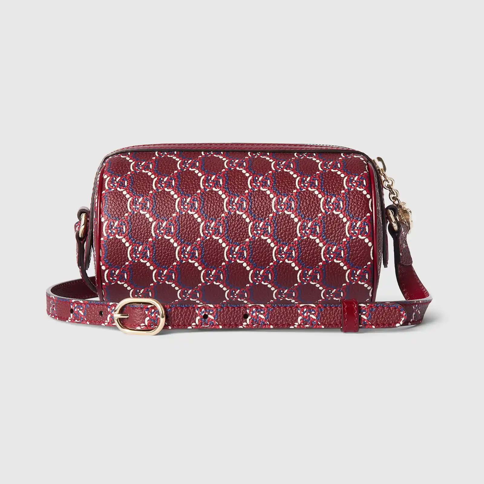 This mini shoulder bag features the optical-effect GG canvas in Gucci Rosso Ancora Red, complete light gold-toned hardware. A matching leather shoulder strap is adjustable through a buckle, while the closure features the signature Gucci Crest zip puller.