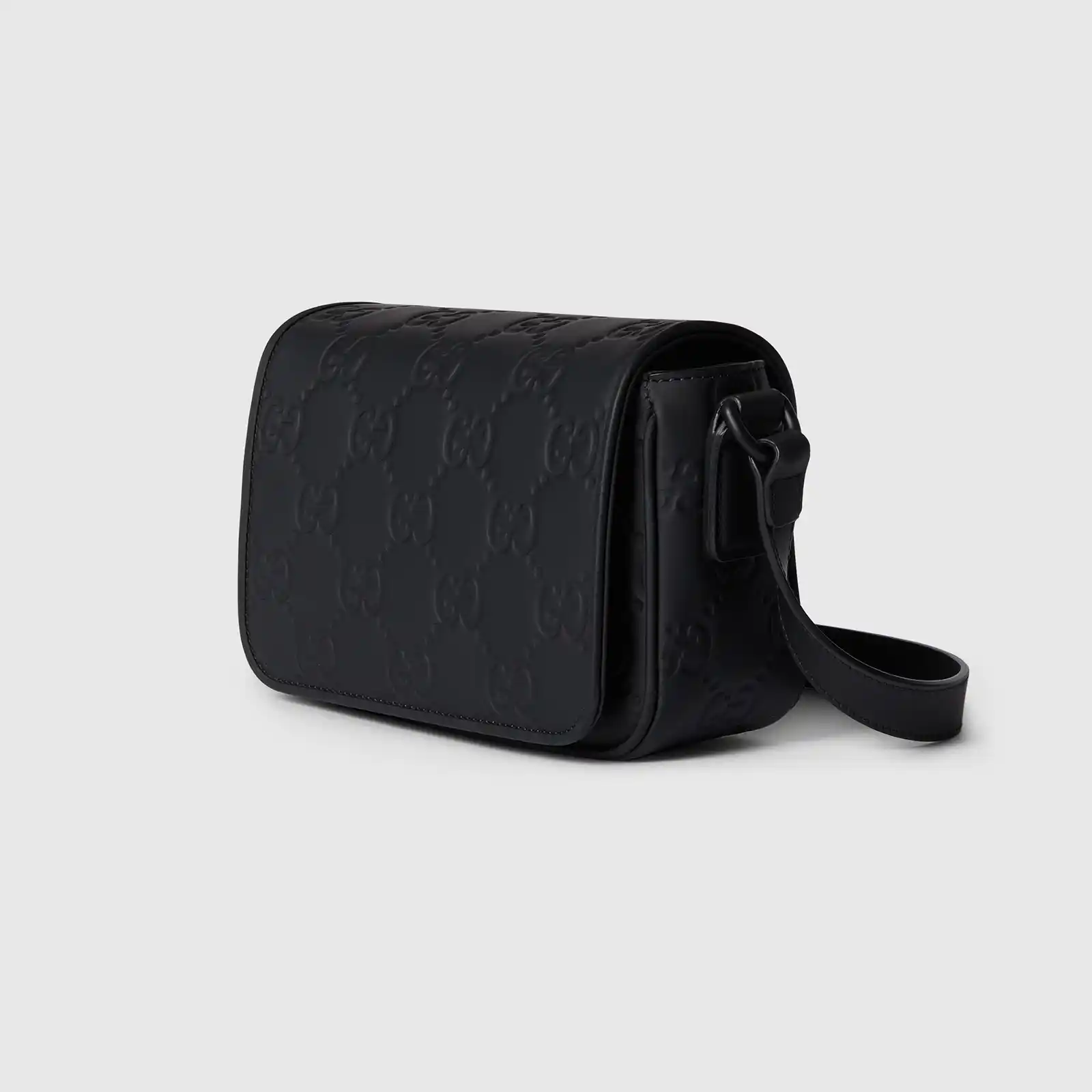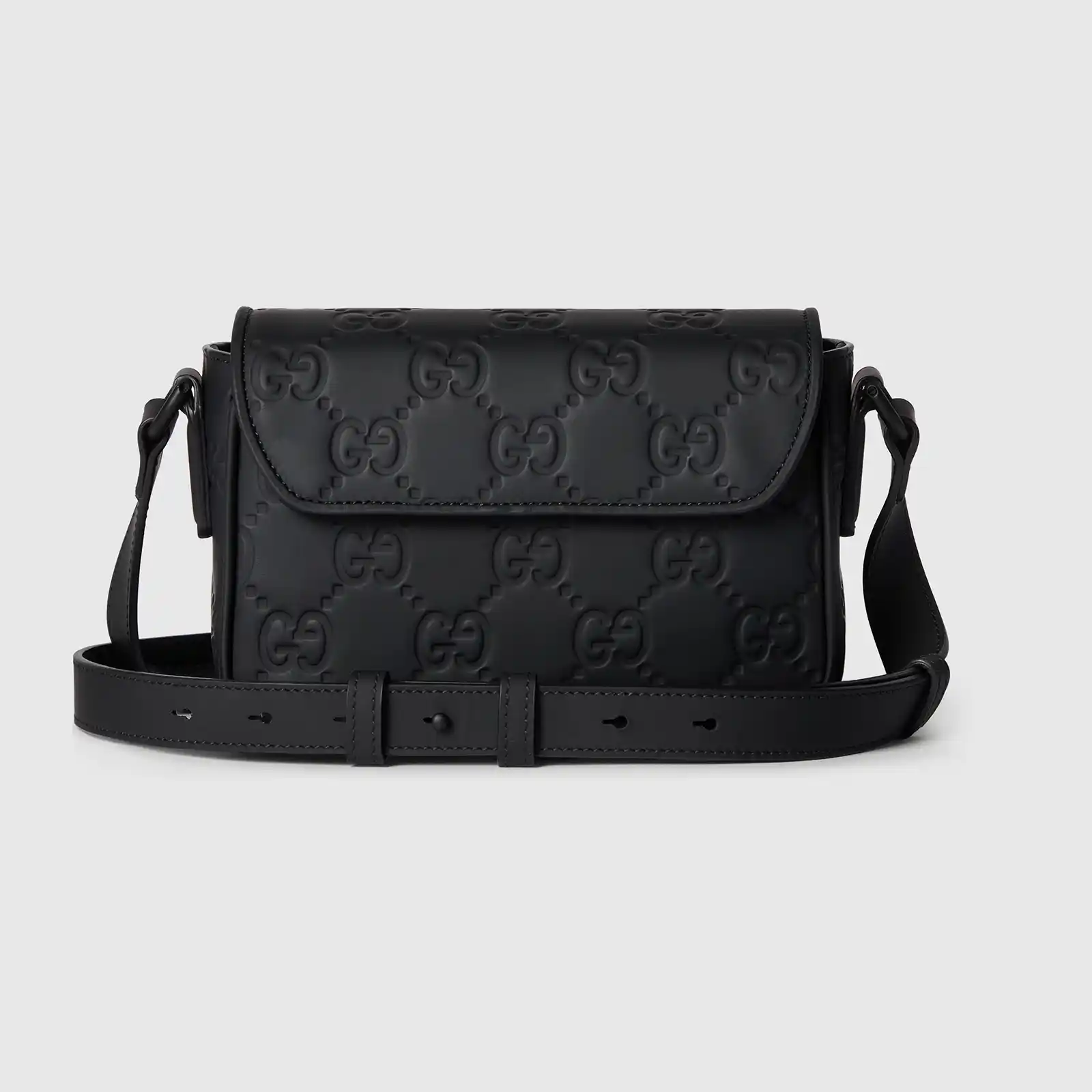 A selection of bags, including mini cross-body bags, briefcases and totes have been reshaped with functional details. Crafted from black GG rubber-effect leather, this super mini bag features two inside card slots and an adjustable shoulder strap.