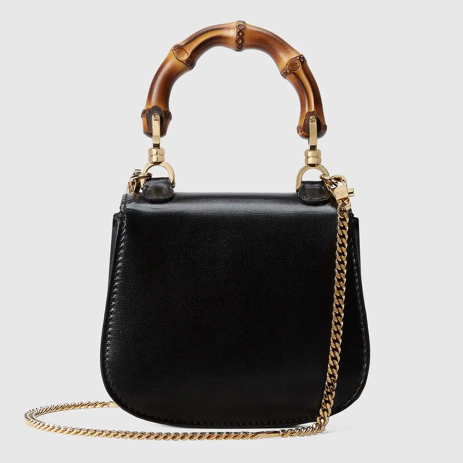 Signature Gucci designs go miniature for Fall Winter 2023. Featuring the same unmistakable hardware and finishes, this black leather Gucci Bamboo 1947 is a playful variation of the original dimensions. With multiple ways to style it, the design is seamlessly integrated into everyday wear.