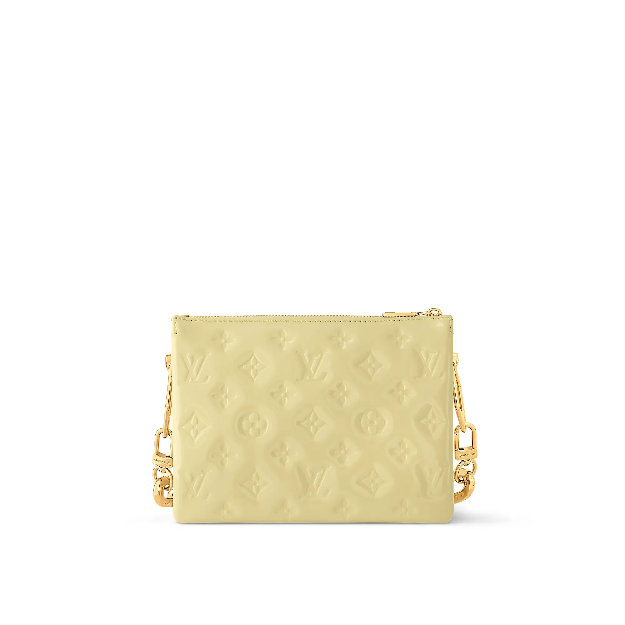 In puffy varnished, the Coussin BB is presented this season in a fashionable new hue with a shimmery finish. Embossed Monogram motifs lend a tactile flair to the piece, which can be carried by its chunky golden chain, worn on the shoulder, or styled as a cross-body bag thanks to the wide, removable textile strap. The removable chain features tone-on-tone resin inserts matching the Chic & Yellow shades.