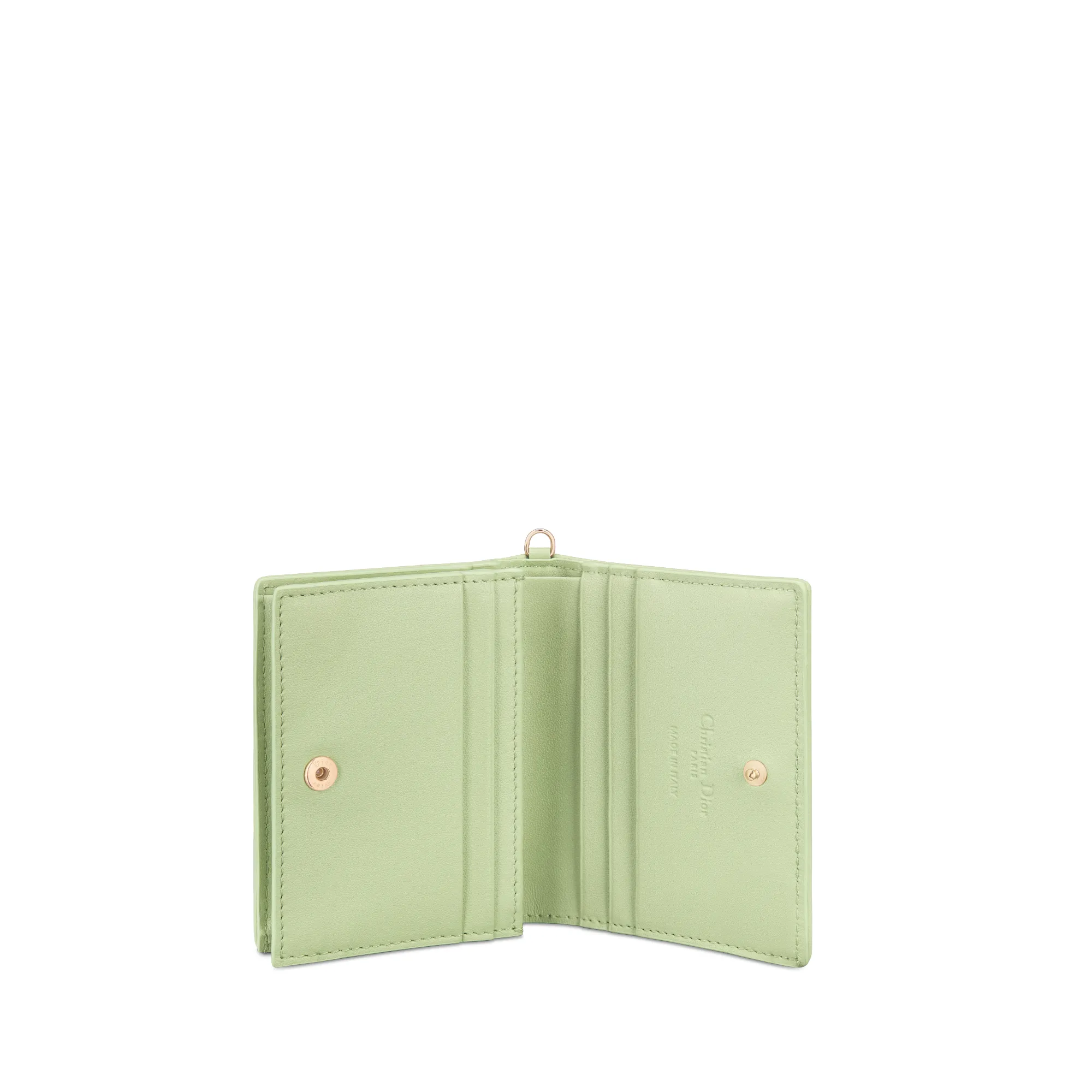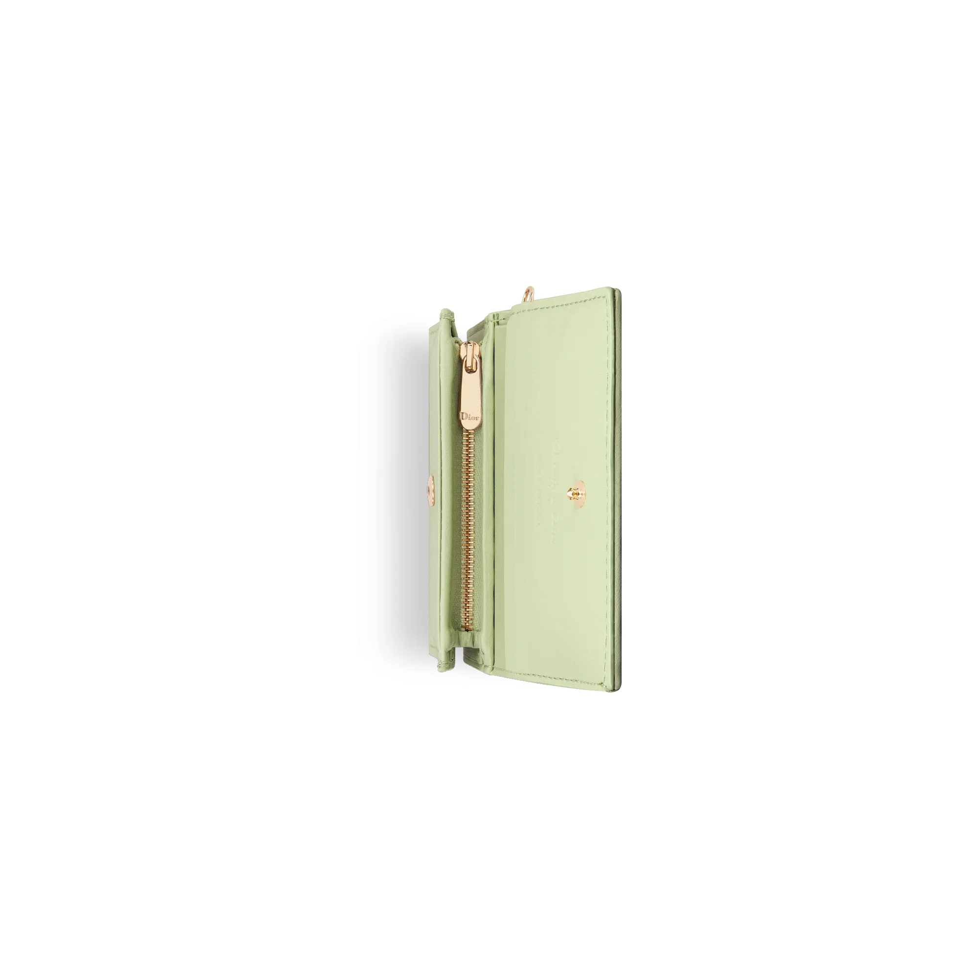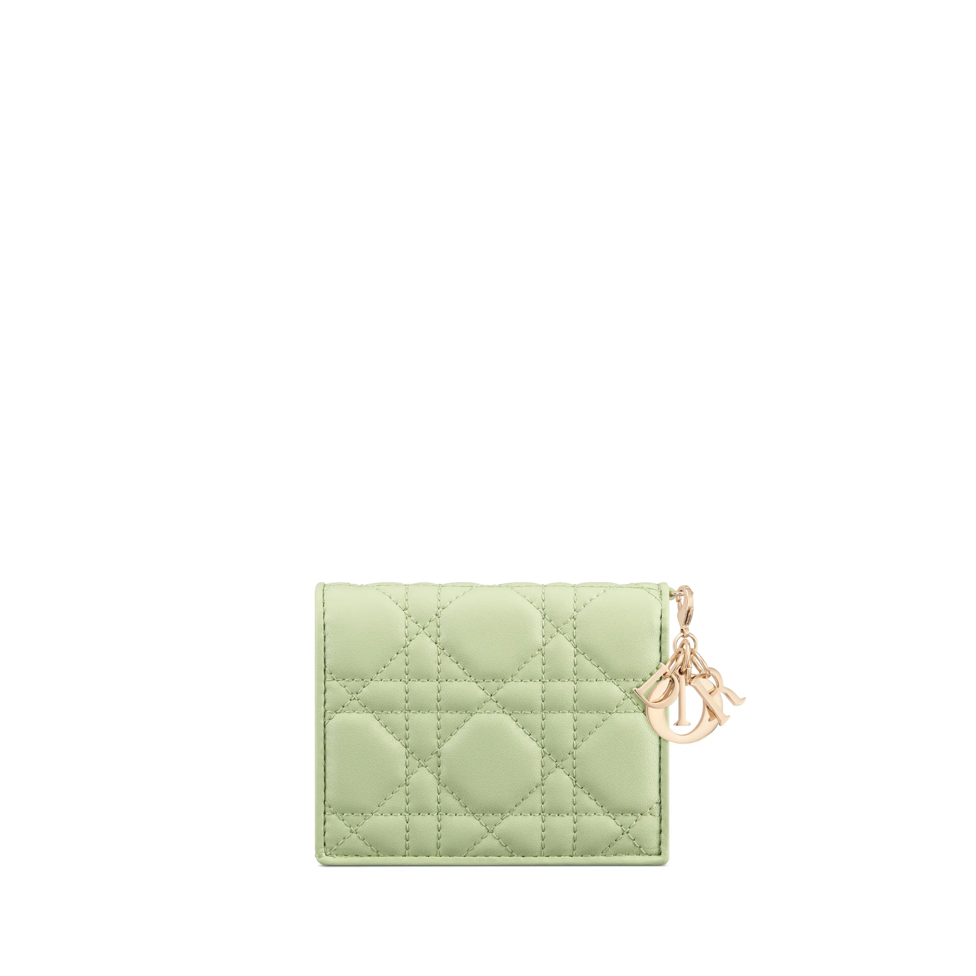 The Lady Dior Gardenia wallet is both compact and spacious. The combination of pale green lambskin with Cannage topstitching and detachable D.I.O.R. charms creates a chic and timeless look. The miniature accessory can hold all the daily essentials and may easily be coordinated with other items from the Lady Dior line.