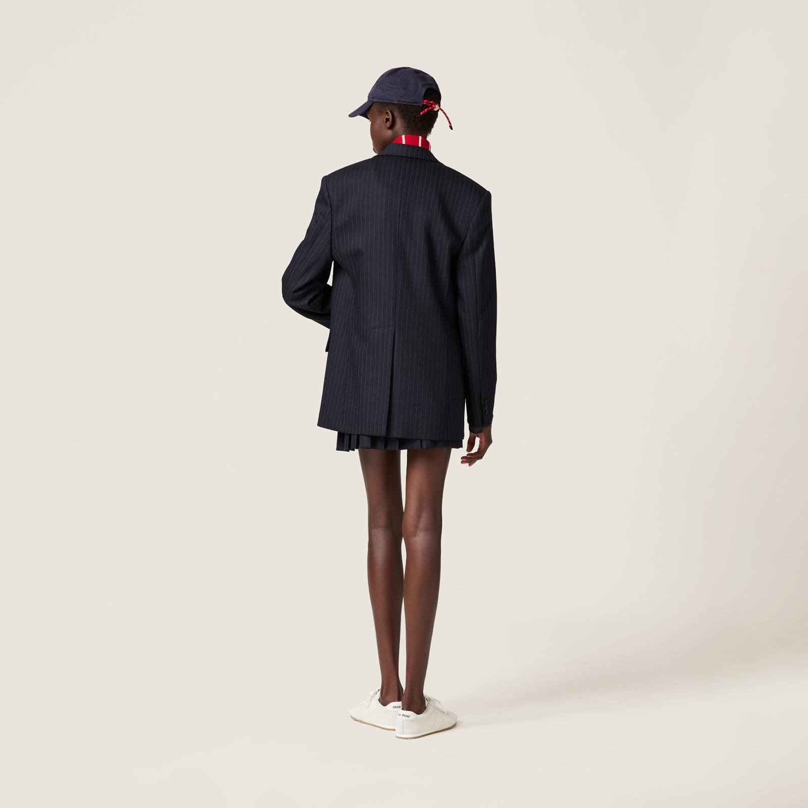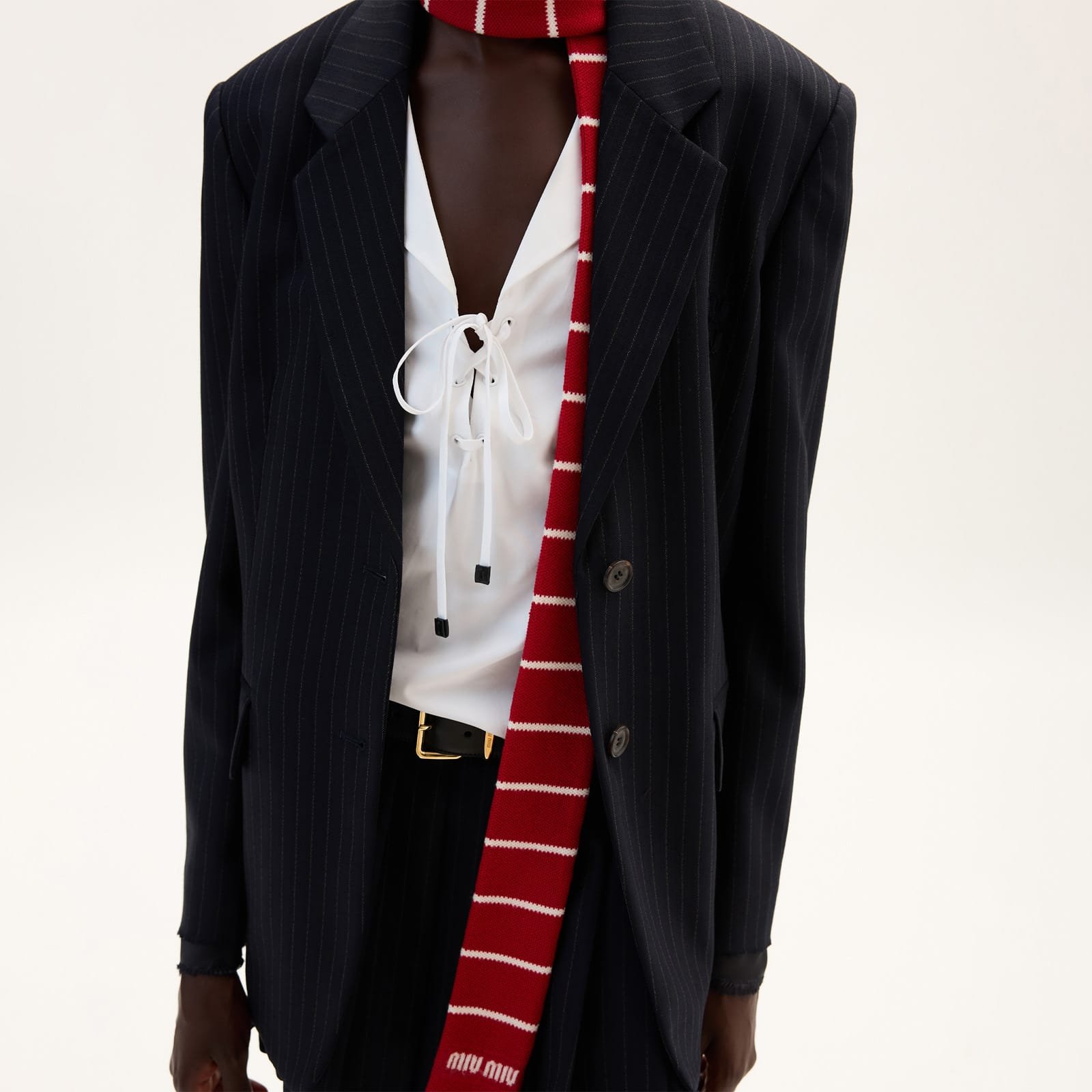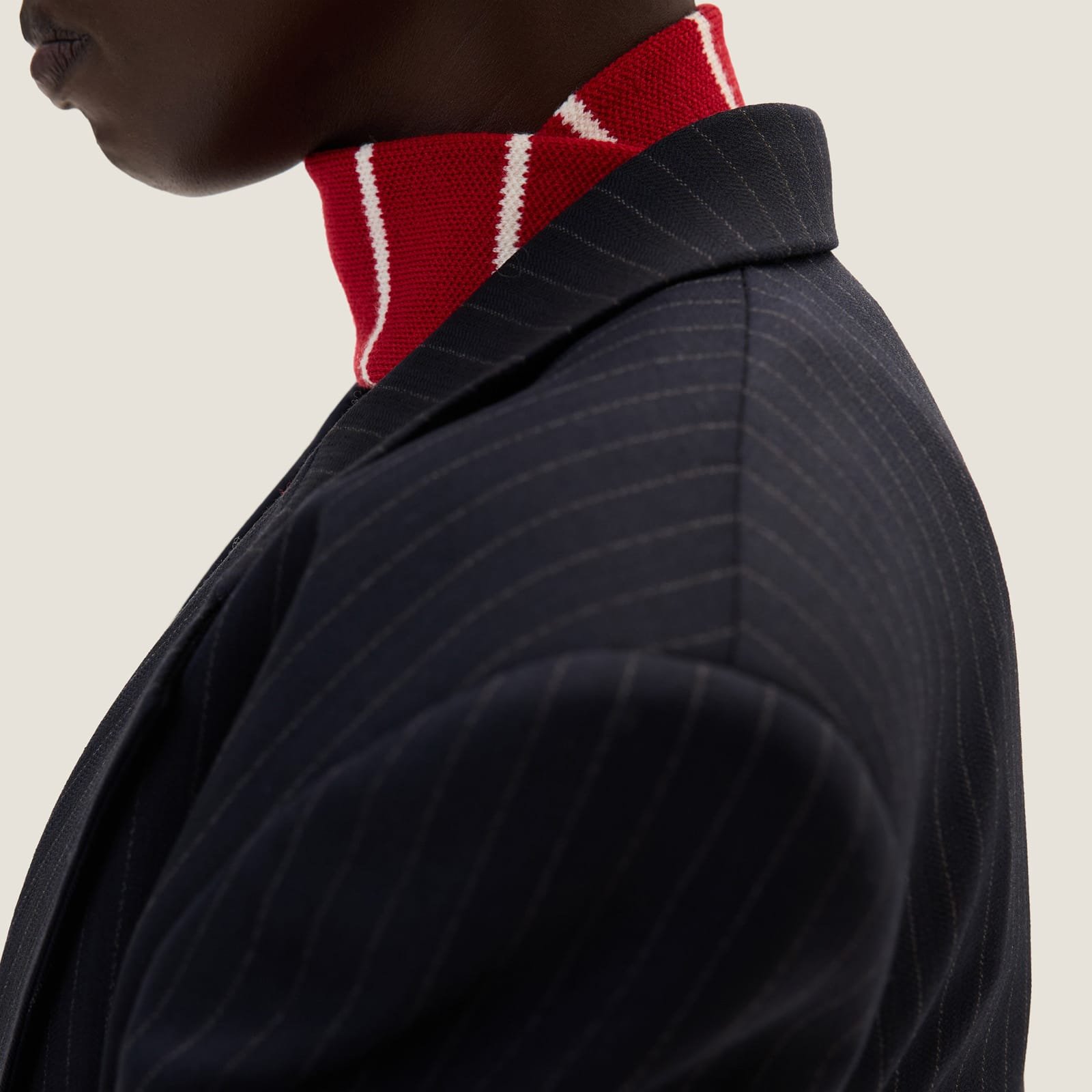 A pinstripe pattern and straight lines, inspired by menswear, are combined in this jacket. The back vent lightens the silhouette while the embroidered logo completes the design with an iconic note.