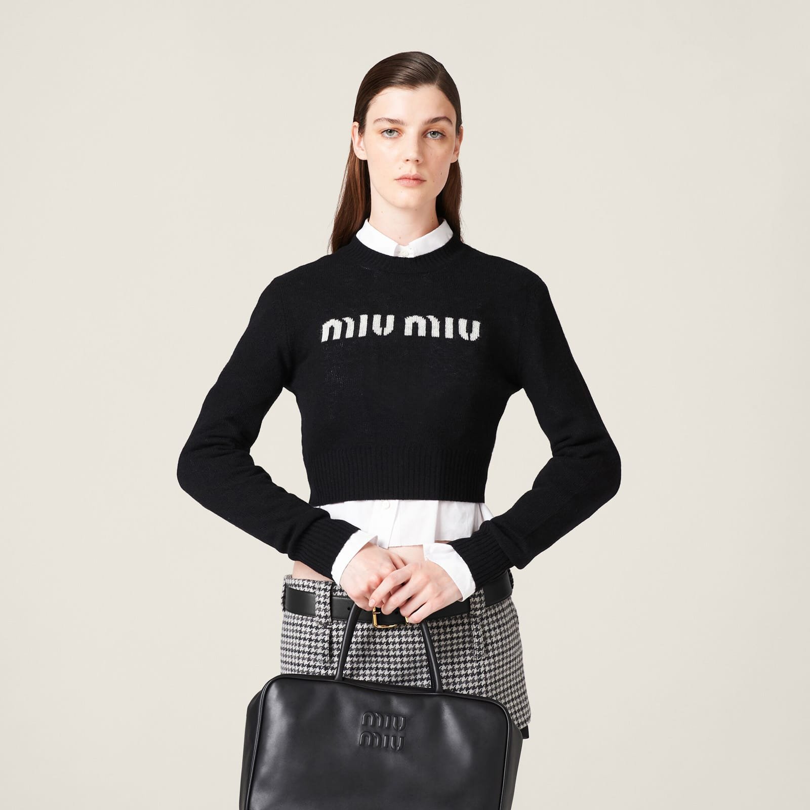 A bold look and effortless femininity characterize this wool and cashmere sweater. The cropped cut with a modern attitude is combined with the contrasting intarsia logo that completes the garment with an iconic note.