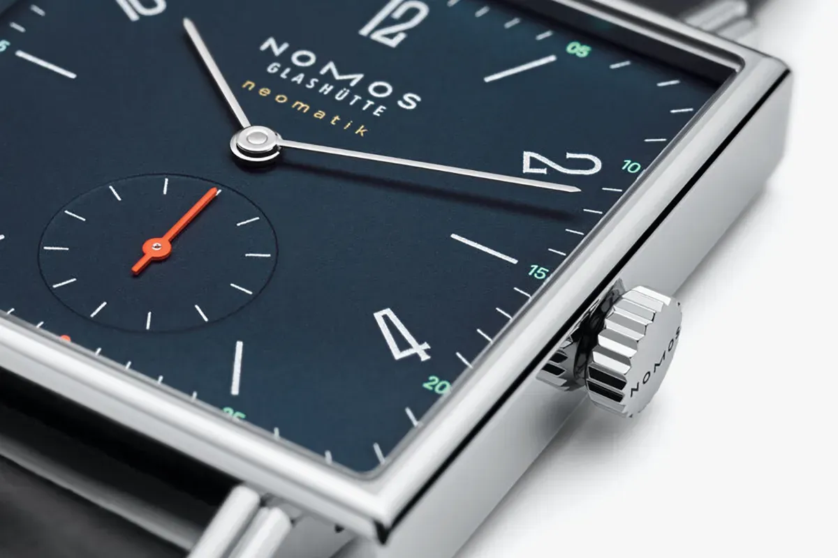 The angular NOMOS classic Tetra as an automatic. The midnight blue dial is the perfect backdrop for the green minute markers and neon orange seconds hand. The automatic caliber is only 3.2 millimeters in height, which allows the watch to remain elegantly slender-and with a diagonal diameter of 46 millimeters, ready for any masculine wrist.