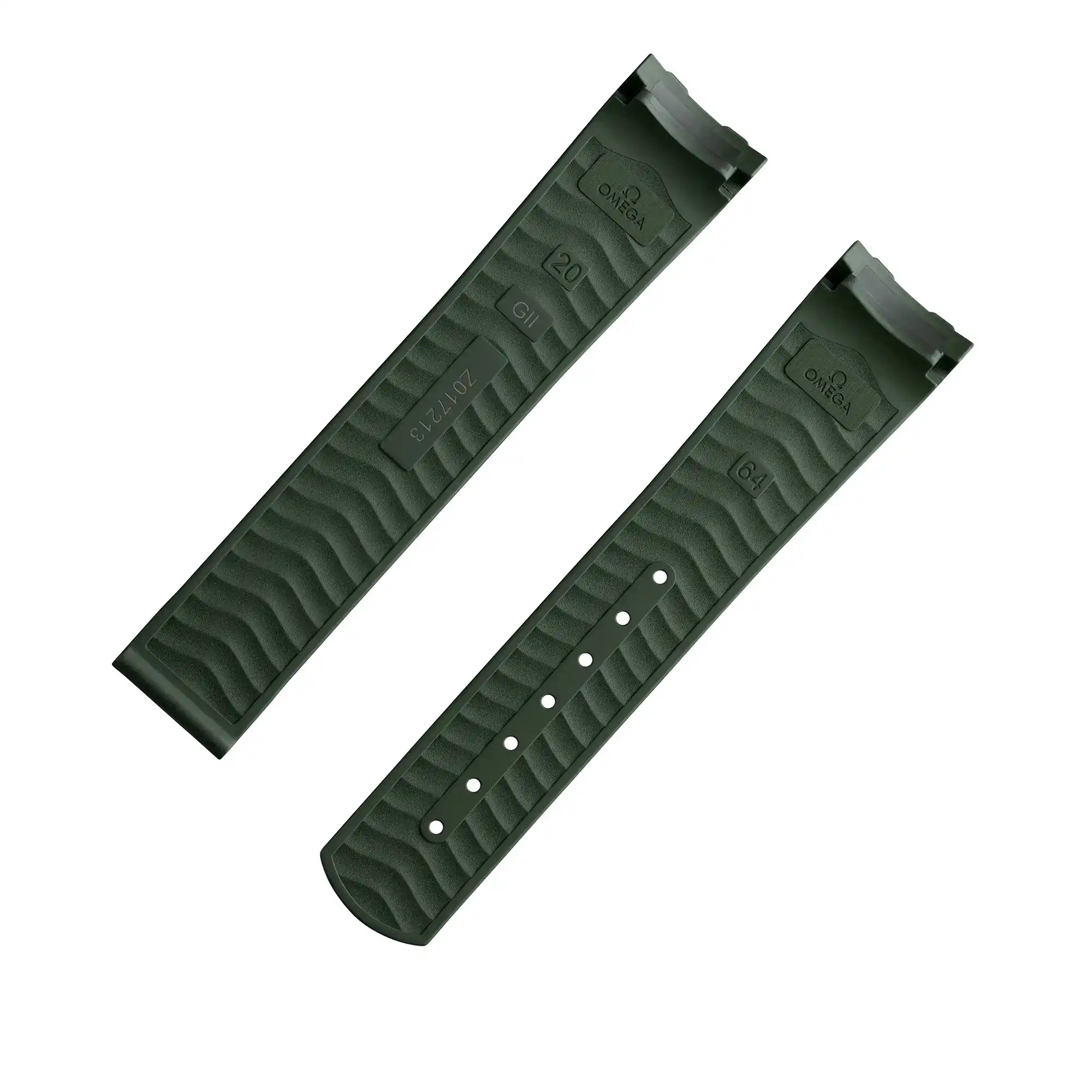 Integrated green rubber watch strap for the 42 mm Seamaster Diver 300M, with inner wave pattern and foldover clasp.