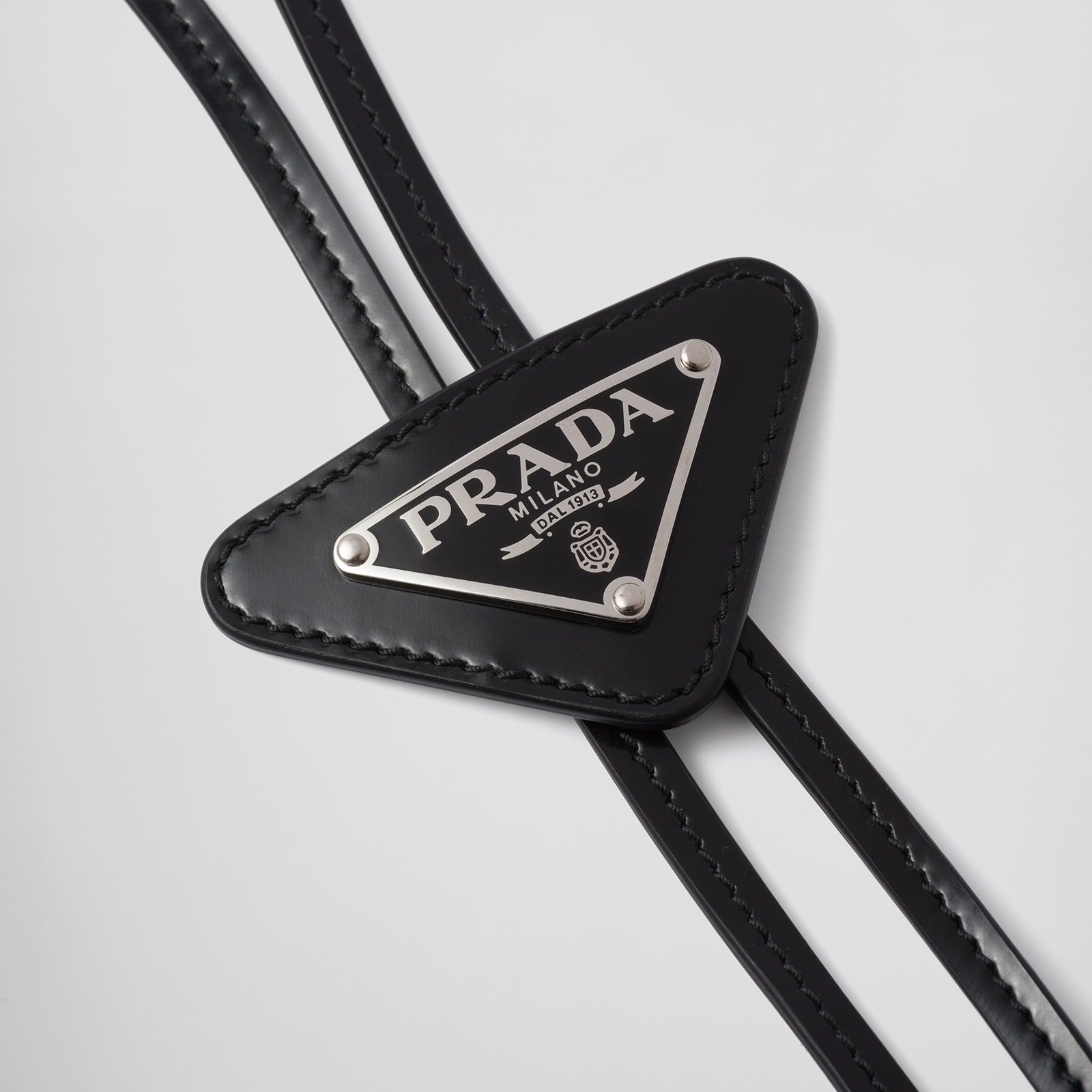This accessory reinterpreting the retro design of the bolo tie is made of brushed leather, an iconic material of the brand. The decorative elegant enameled metal triangle logo becomes a structural detail.