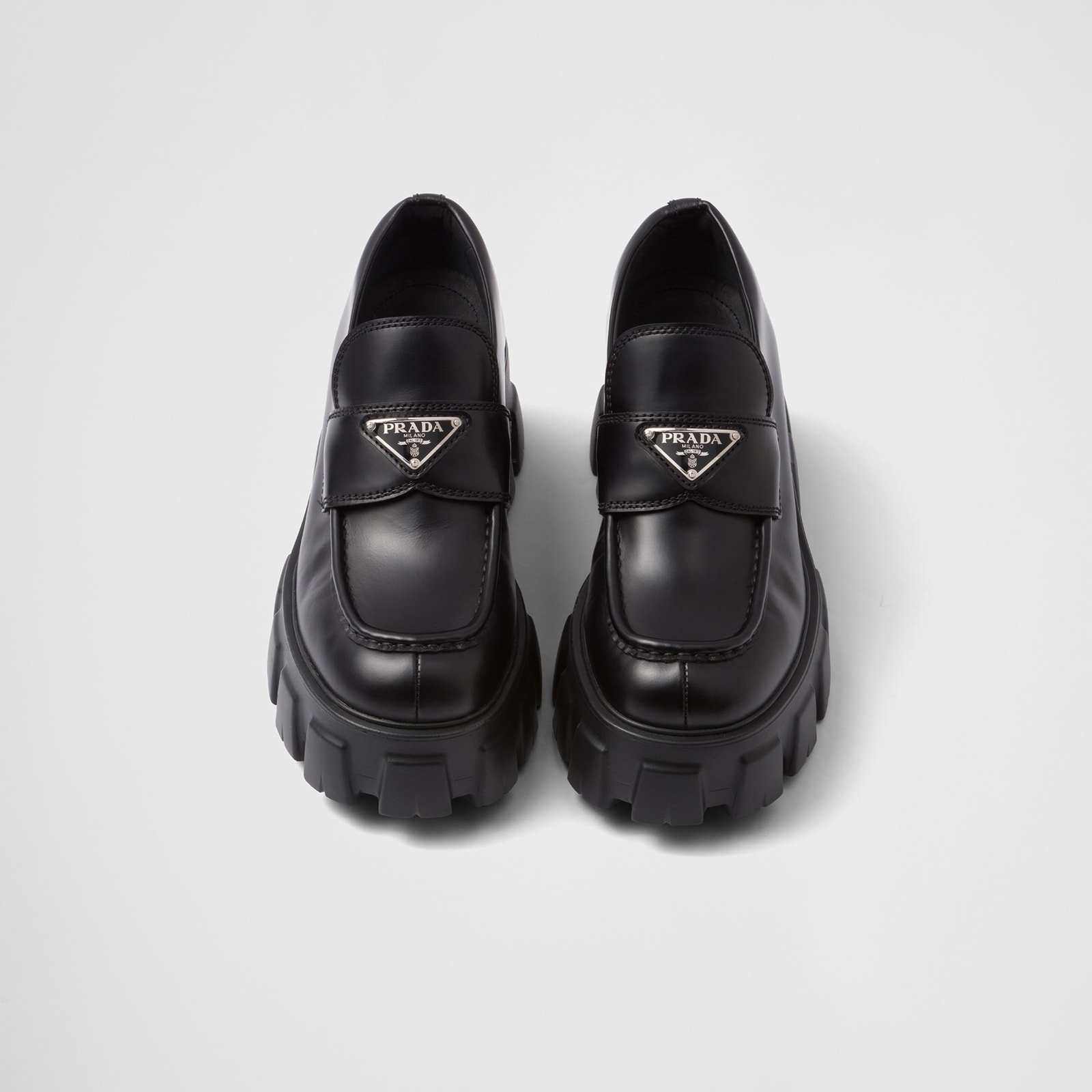 The Monolith loafers made of Prada’s iconic and elegant brushed leather reinterpret the classic penny loafer in an original and contemporary way. This shoe, which takes its name from the chunky rubber sole, is an expression of timeless design that is monolithic and unique for its research, innovation, and style.