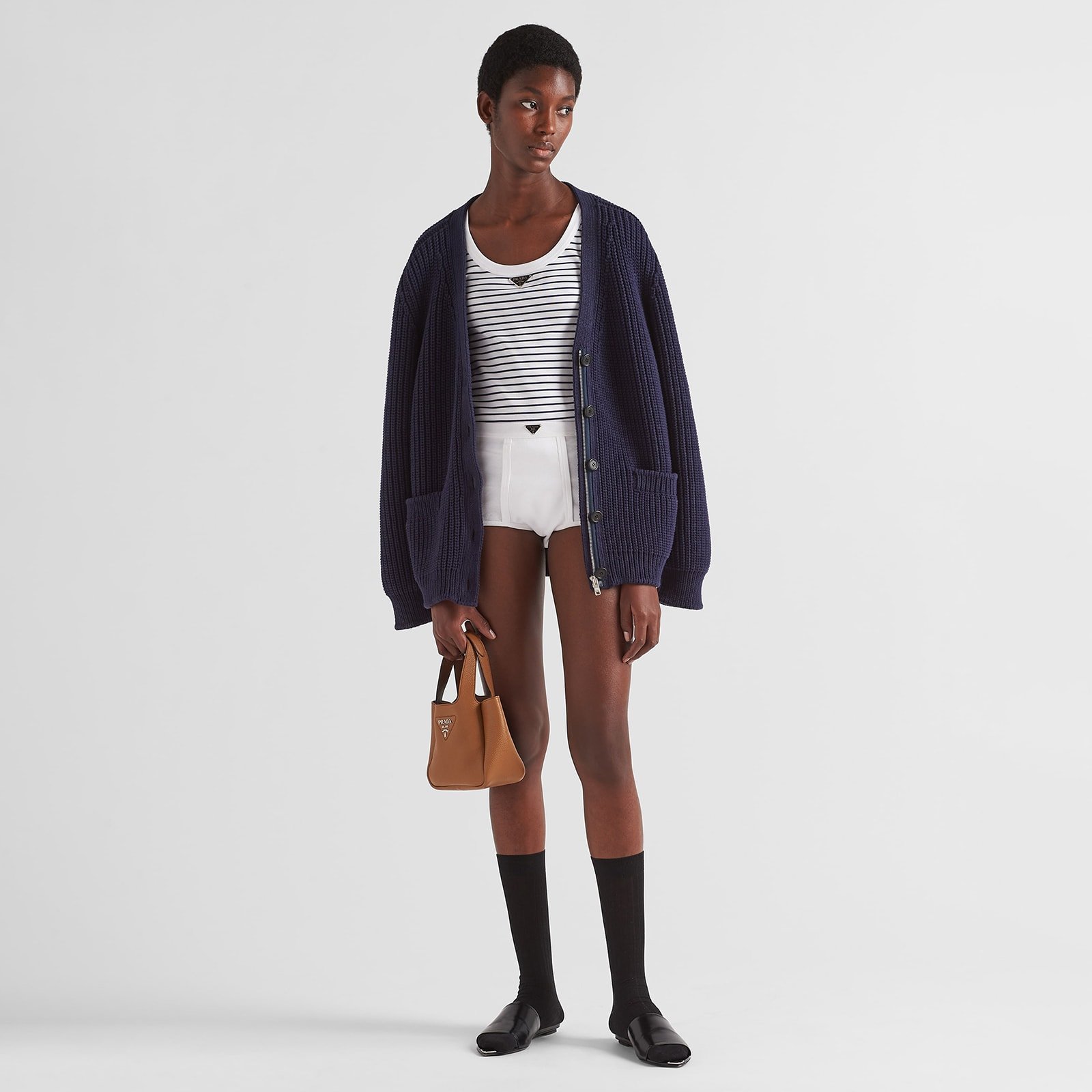 This cotton cardigan is defined by the ribbed knit and menswear fit. The garment is completed by the breast pocket on the front and the knit triangle logo on the back.