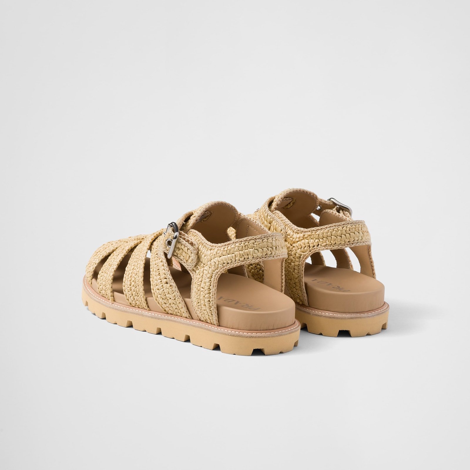These sandals reinterpret a retro beach silhouette with contemporary lines and details. The crochet style is completed by the enameled metal triangle logo, the iconic signature of Prada collections.