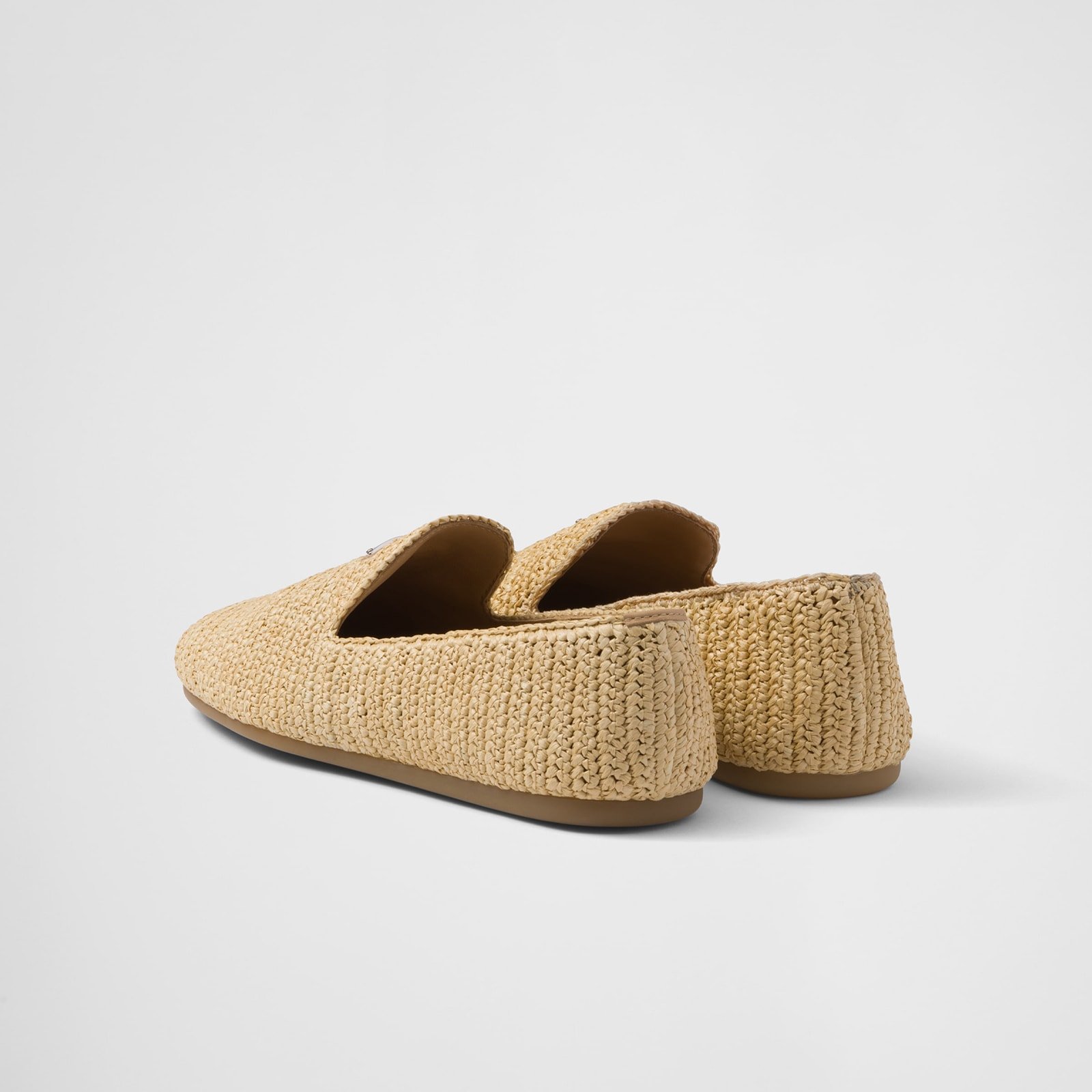 Crochet adds a light, summery touch to these slip-on shoes’ simple, tapered silhouette. The iconic enameled metal triangle logo enhances the footwear with casual charm, and thin rubber soles complete the look.
