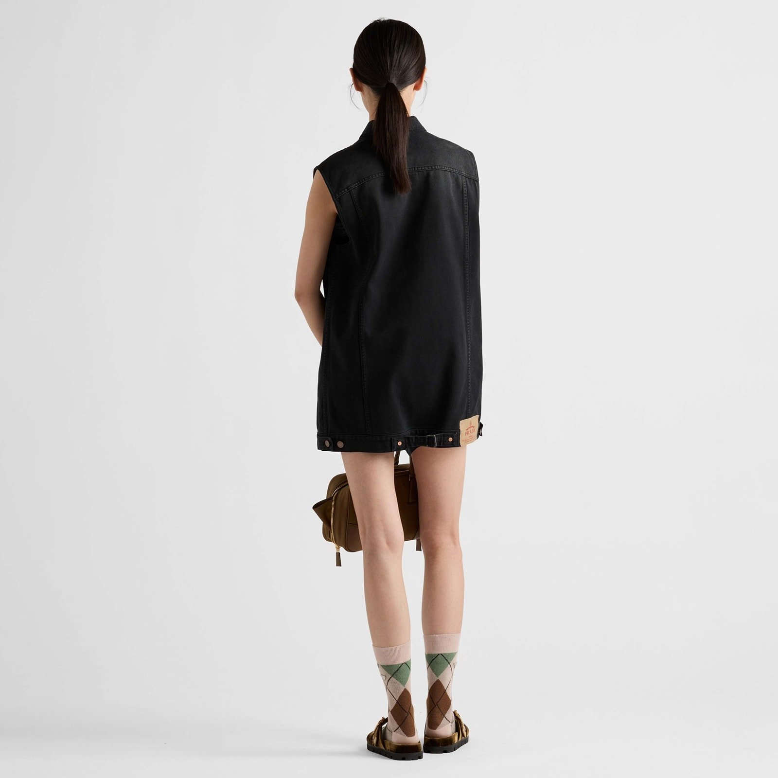 Washed denim gives this straight mini-dress vintage allure, enriched with distinctive workwear-style details. The style is completed by the archive logo printed on a label and the sleek and iconic geometric shape of the enameled metal triangle logo.