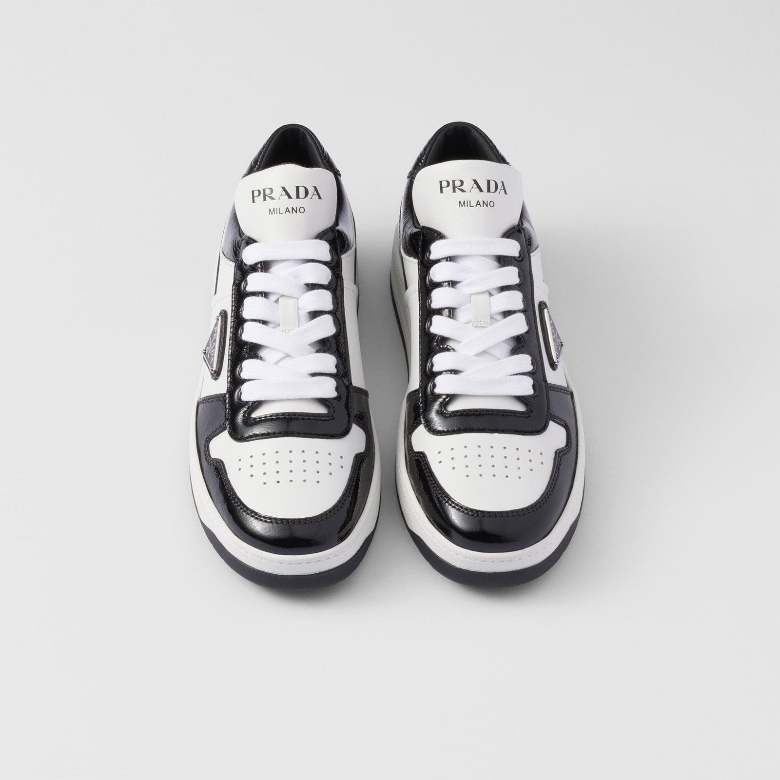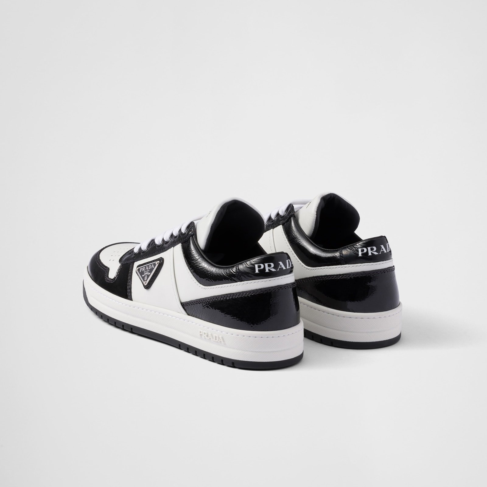 Downtown sneakers stand out for their versatile and contemporary style inspired by vintage, sporty designs. Patent leather details elevate the iconic silhouette, characterized by perforated leather uppers and decorated with the enameled metal triangle logo.