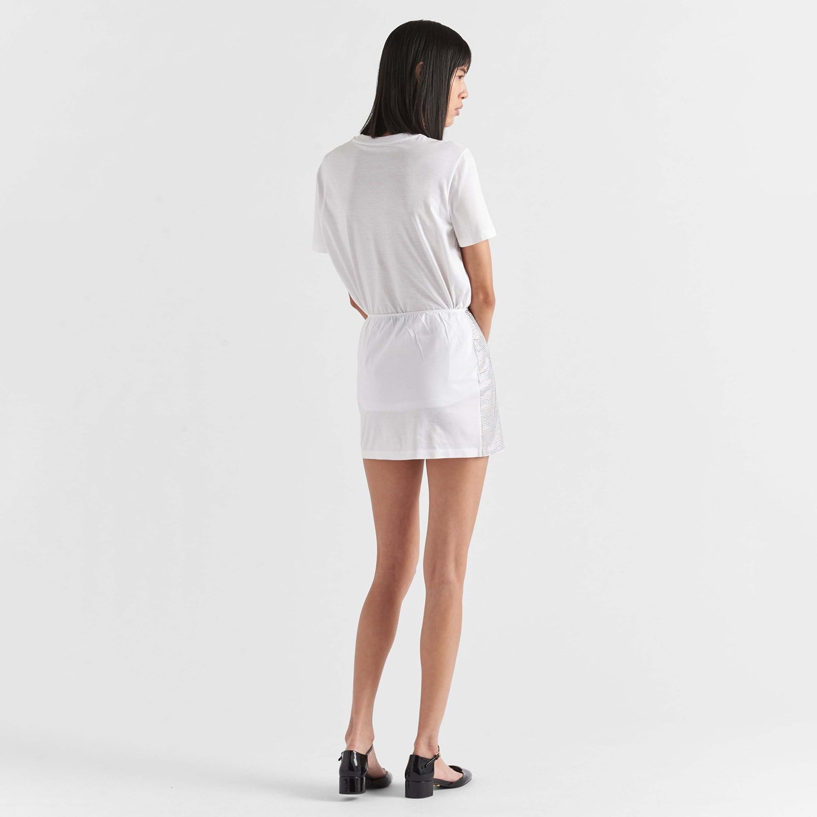 This miniskirt with a minimalist cut enhanced with precious details expresses a refined, contemporary aesthetic. The silhouette with straight lines is covered with sparkling tonal rhinestones applied on the front, which give the garment a shimmering touch of elegance.