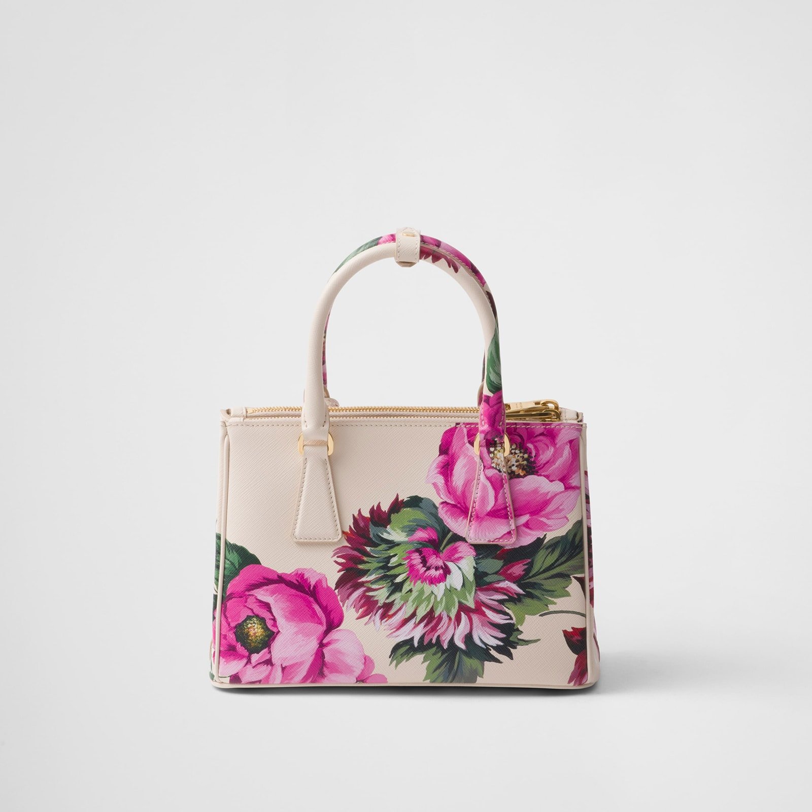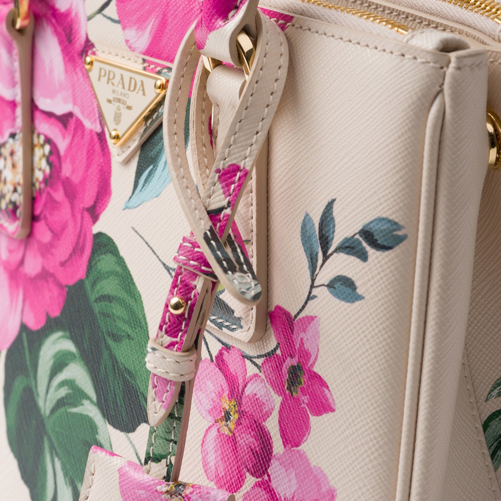 The sophisticated and timeless Prada Galleria bag blends industrial precision and the refined accuracy of craftsmanship in a design that celebrates the historic shop opened in the Galleria Vittorio Emanuele II of Milan in 1913. Consisting of more than 80 separate pieces assembled by hand, the style reveals a versatile and universal nature that makes it the perfect canvas for always new interpretations. The accessory, characterized by the iconic three pockets, features the distinctive crosshatch pattern with waxed finish of Saffiano leather, animated by an elegant floral print in vibrant colors.