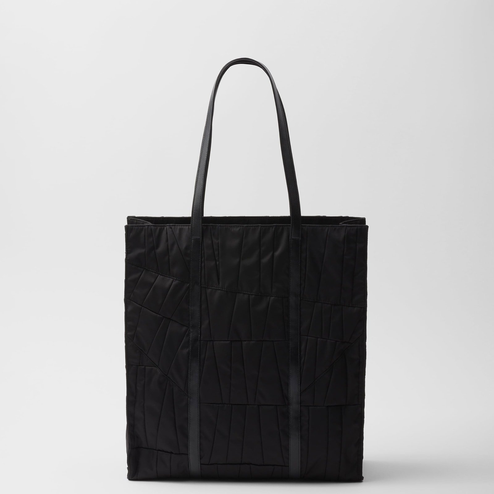 This tote bag combines an ample silhouette with sleek geometric lines and unique and precious details. Made of Re-Nylon, the innovative regenerated nylon fabric, the bag is characterized by the refined patchwork motif and enhanced with shiny handmade embroidery reminiscent of elegant art deco embellishments. The refined design, completed with leather handles, is decorated with the iconic enameled metal triangle logo. For sustainable care to preserve the product’s characteristics and reduce microfiber shedding, we recommend not washing the item too often. Let the product air out after every use and have it dry cleaned at a specialized ecological dry cleaners.