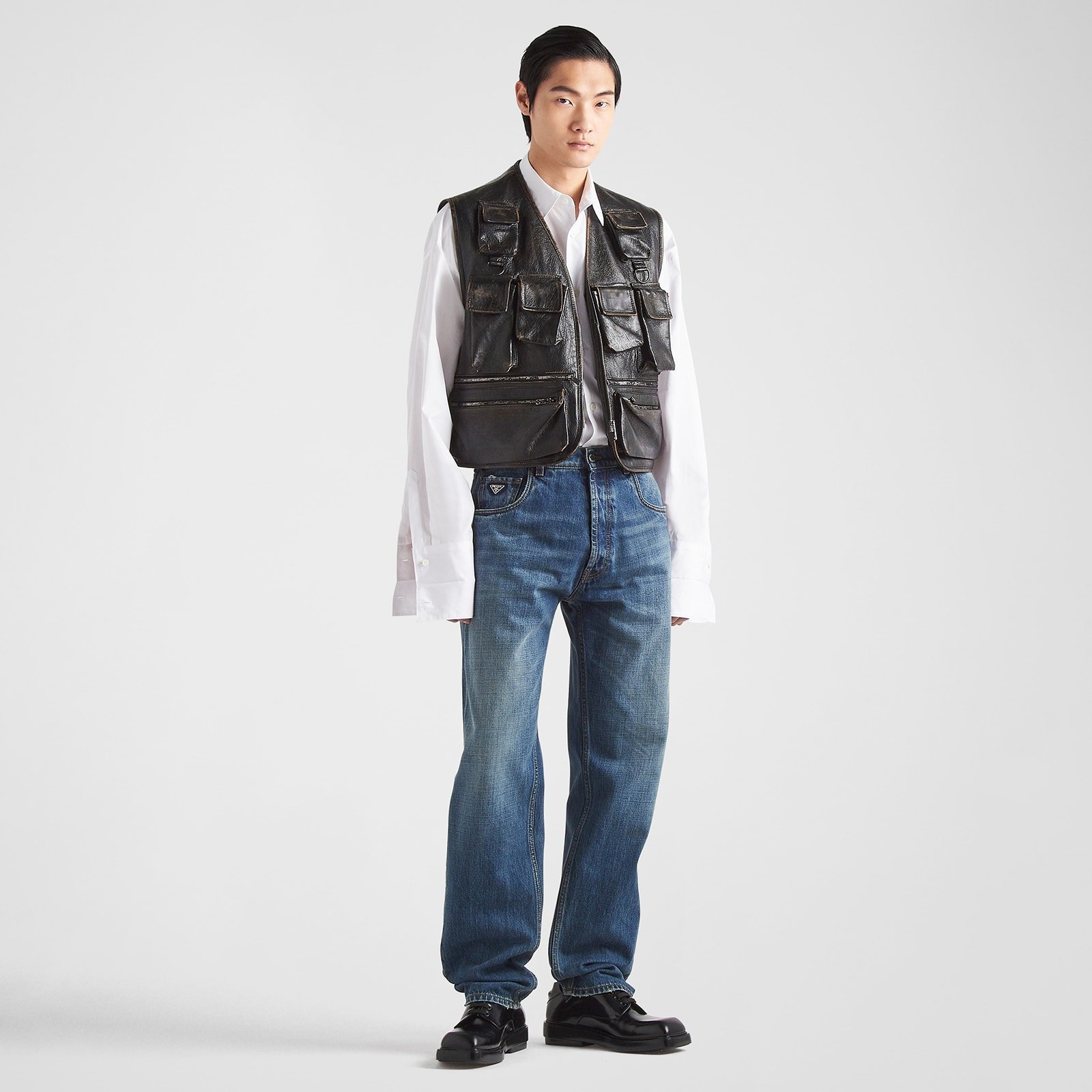 Fluid and contemporary stylistic codes reinterpret iconic silhouettes, in a process of redefining forms and meanings. This vest transforms the reporter jacket into a hybrid garment blending design and functionality, emphasized by the leather processed with a unique vintage effect. The style is defined by the distinctive utility pockets which acquire the dual value of pragmatic elements and refined details. Presented with a conceptual design, the leather triangle logo complete the garment with a sleek, distinctive signature.