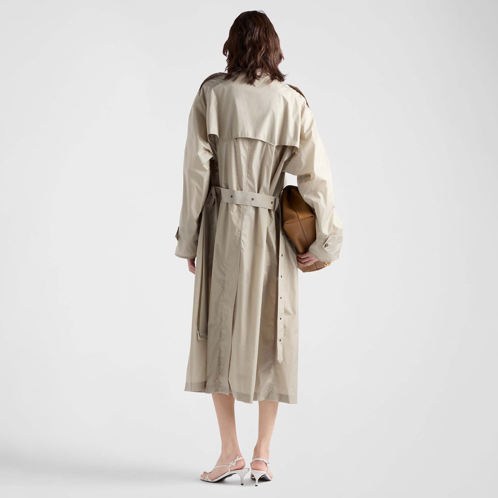 The silhouette of this technical fabric trench coat with contemporary style is inspired by menswear. Oversized lines create a sophisticated, minimalist garment constructed with classic details reinterpreted with a sleek design, like the iconic fabric triangle logo that adds its signature to the style with a distinctive note.