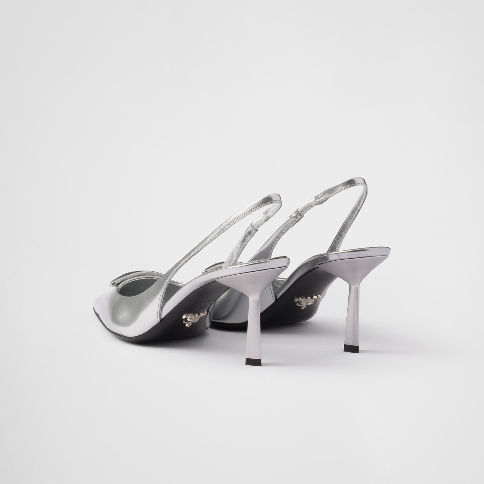 These metallic leather pumps characterized by a tapered, pointy toe silhouette express contemporary, feminine elegance. The iconic geometric shape of the triangle inspires the geometric line of the heel that gives the design a modernist note.