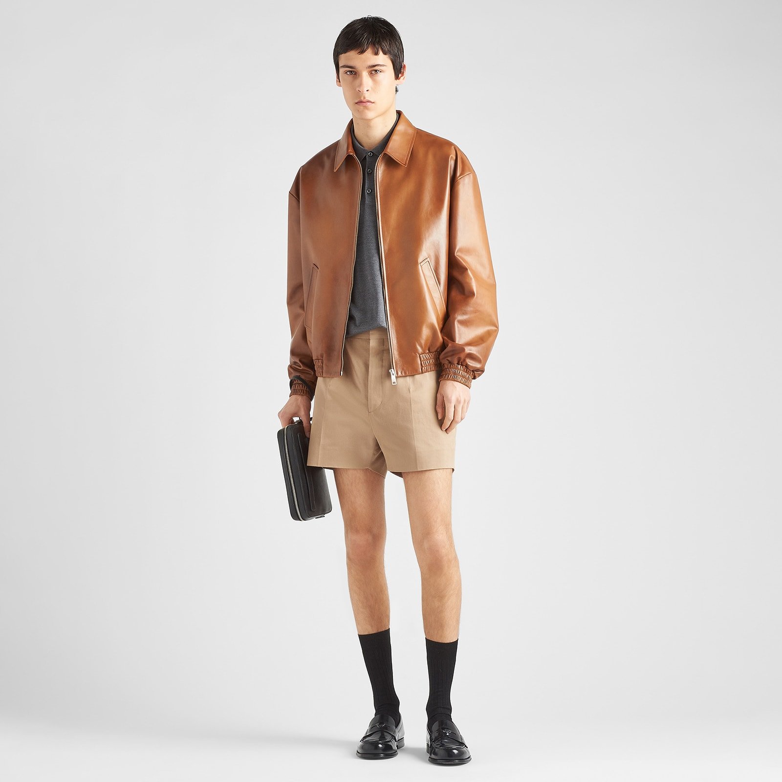 With an enveloping, oversized design that emphasizes streetwear volumes, this soft nappa bomber jacket is hand-waxed for a glossy finish. Reinterpreted in a conceptual way, the iconic Prada triangle takes on a structural role in the garment, transforming into a tonal leather patch.