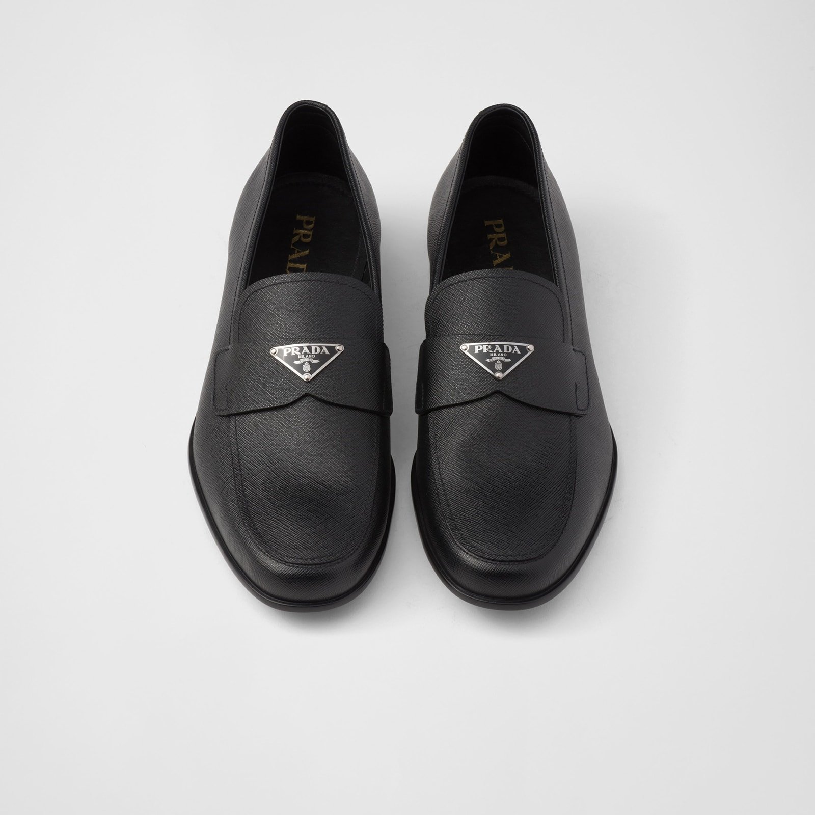These loafers made of iconic Saffiano leather are characterized by the triangle logo on the saddle strap.