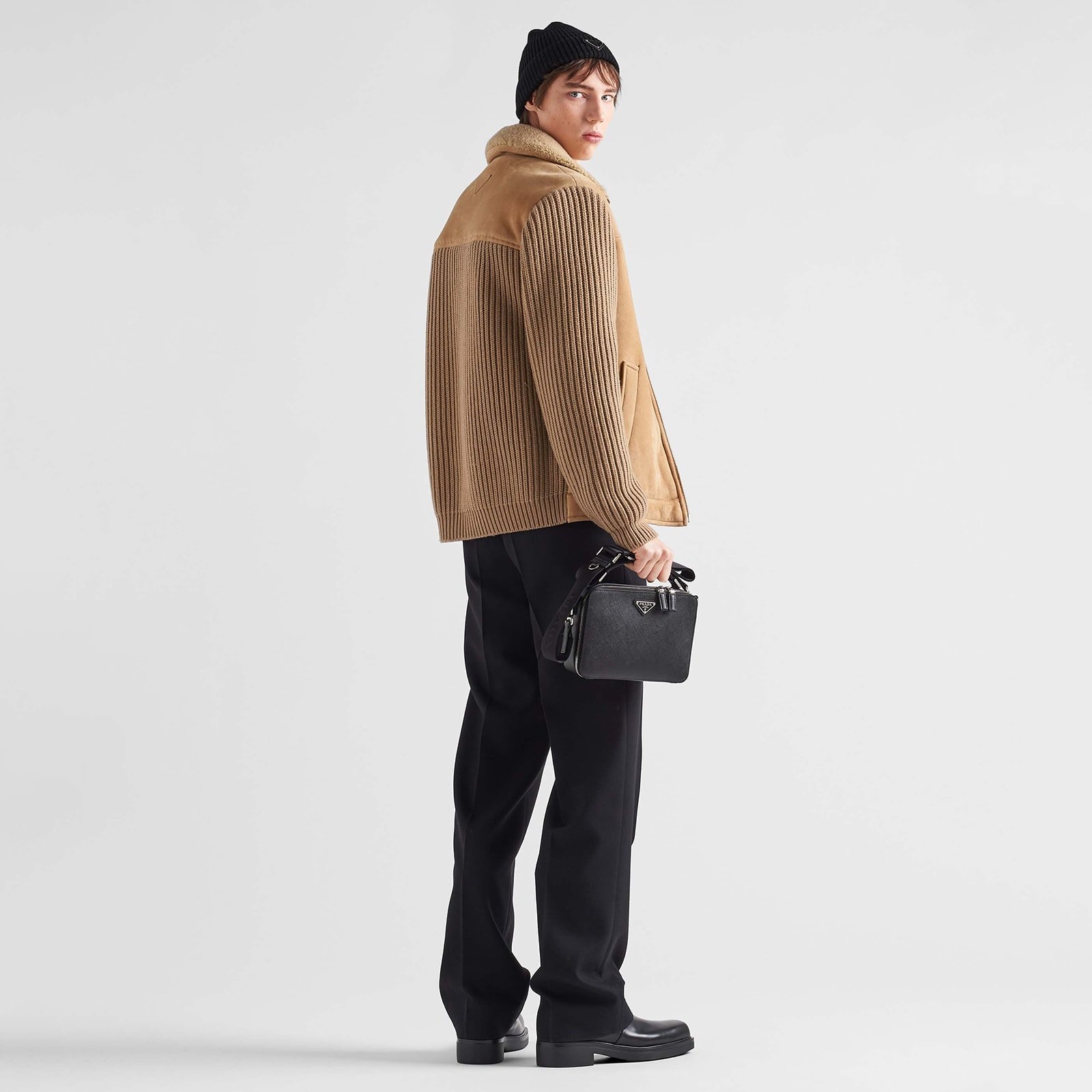 An unprecedented mix of materials defines the design of this shearling jacket with knit sleeves. The collar in a refined nuance is distinctive.