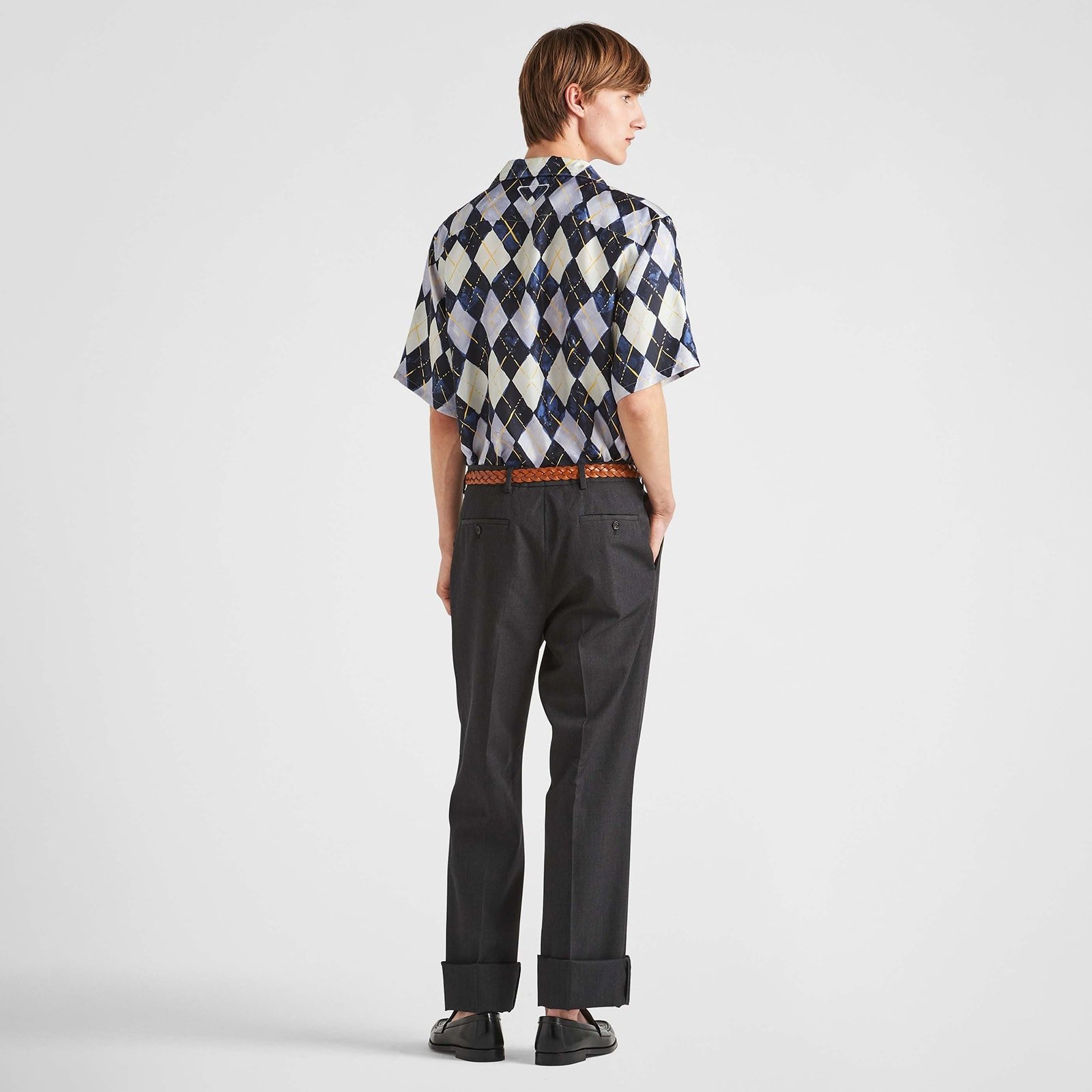 This shirt with a Cuban collar combines a sporty attitude and retro inspiration in a design with a refined allure. This style, with an oversized silhouette, is made of silk twill and features a vibrant Argyle print with vintage charm. Embellished with mother-of-pearl buttons, it sports the iconic fabric triangle logo.