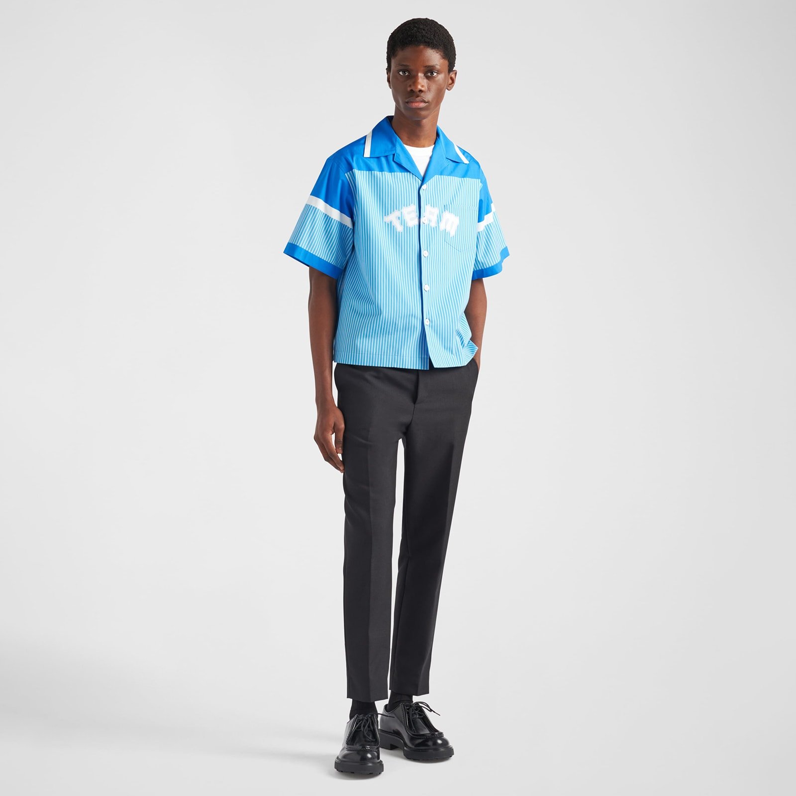 The bowling collar is reinterpreted with a retro print that emphasizes the sporty attitude of the design. The cotton garment with an oversized silhouette is decorated with the distinctive geometric shape of the triangle logo.