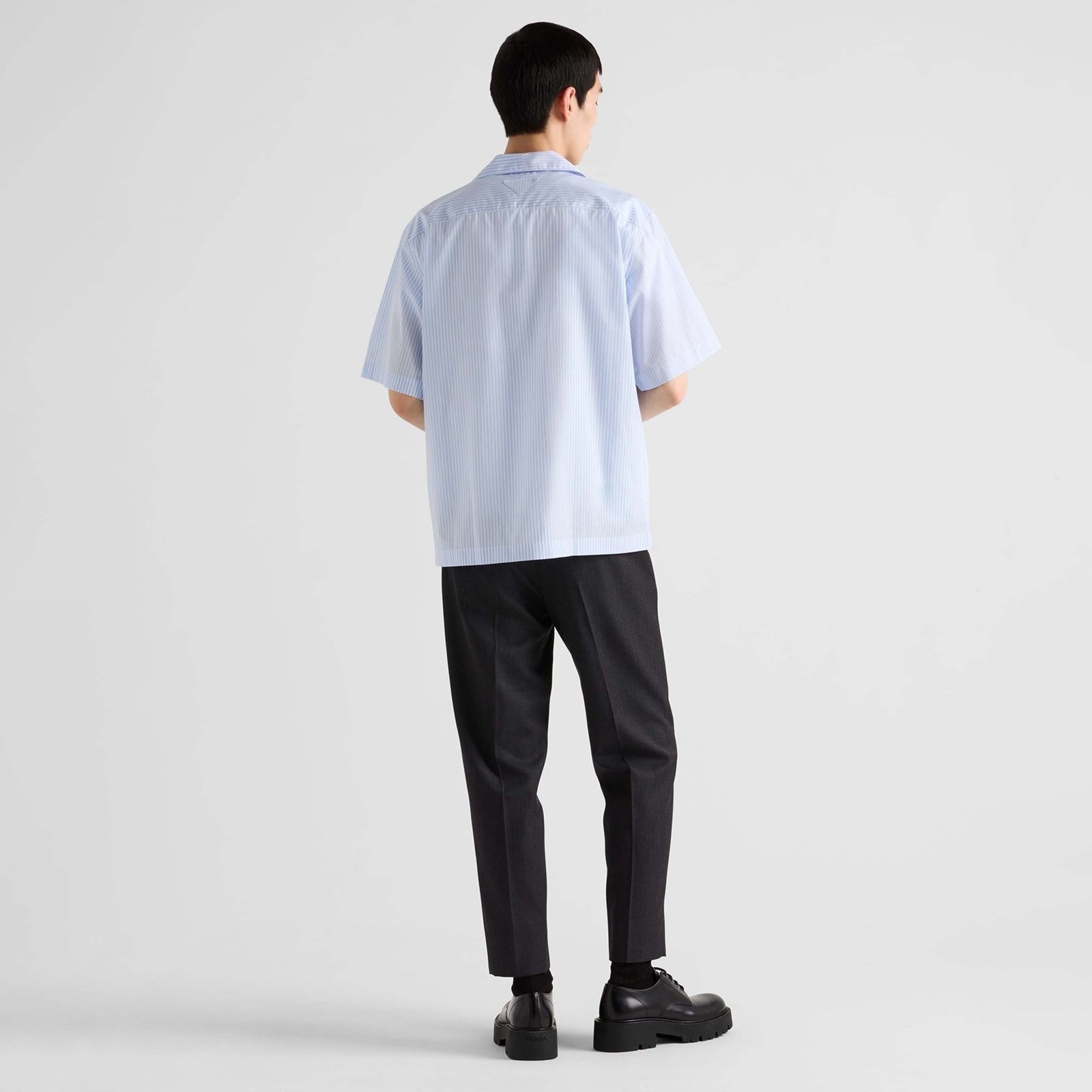 The shirt with bowling collar combines a sporty attitude and retro inspiration in a design with refined allure. The style with an oversized silhouette made of cotton is animated by a delicate stripe pattern that recalls a summer atmosphere. The garment embellished with mother-of-pearl buttons is decorated with the lettering logo printed in a contrasting color on the breast pocket and by the iconic fabric triangle logo on the back.