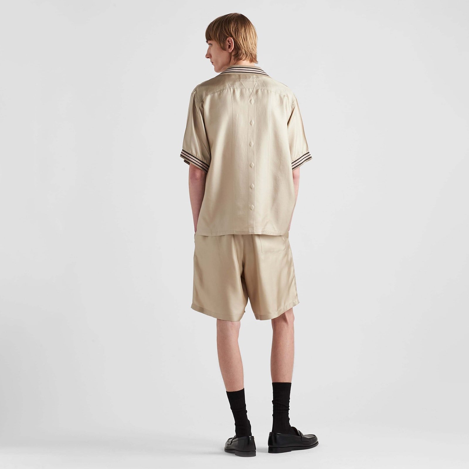 The iconic design of this shirt with bowling collar is reinterpreted with a precious touch blending retro moods and a sporty inspiration. The silk twill style has a boxy oversized silhouette defined by the knit collar and sleeve trim. The lettering logo printed on the breast pocket completes the light, refined style.