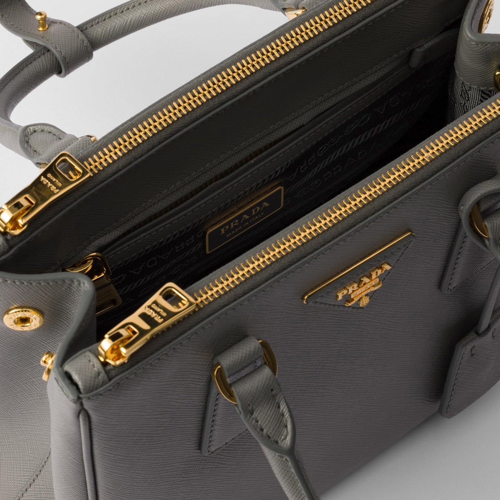 The Prada Galleria bag, which exemplifies Prada’s centennial excellence in luxury leather goods, becomes a reflection of the brand’s modernity and stylistic identity that seeks to interpret kaleidoscopic contemporaneity through a pragmatic design and structured lines. The accessory, presented in the small version, is made of iconic Saffiano leather that was patented by the founder of the brand and features a crosshatch texture and waxed finish. The Prada Galleria bag, named after the historic Prada store opened by Mario Prada in 1913 in Galleria Vittorio Emanuele II in Milan, expresses the quintessence of the brand’s timeless elegance.