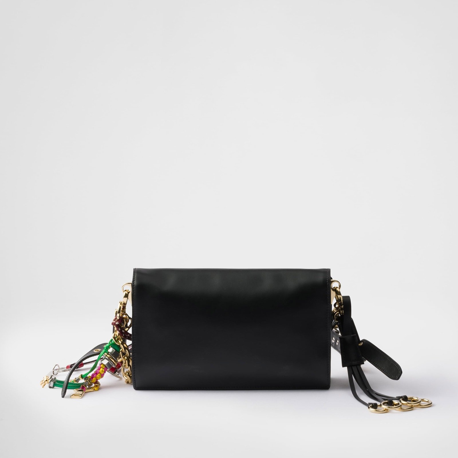 Contemporary and versatile, the new Prada Soft Sound bag is crafted from leather with a compact, two-compartment design, finished with gold-toned hardware. The accessory boasts various removable bag charms that decorate with a playful and unique touch.
