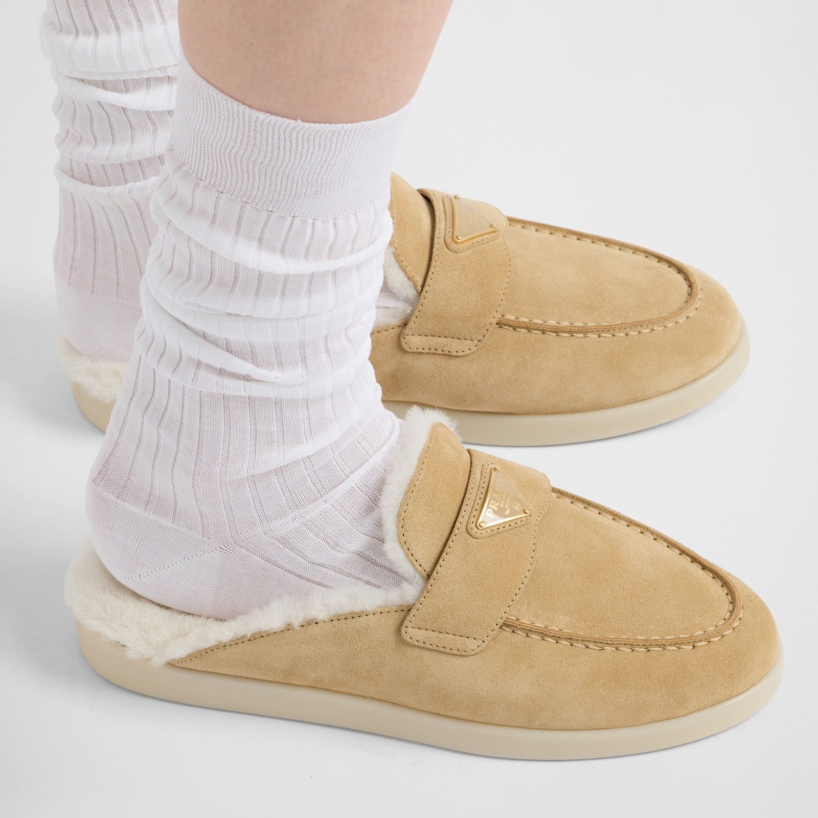 These suede mules with a sleek, modern silhouette are completed by a soft shearling lining.