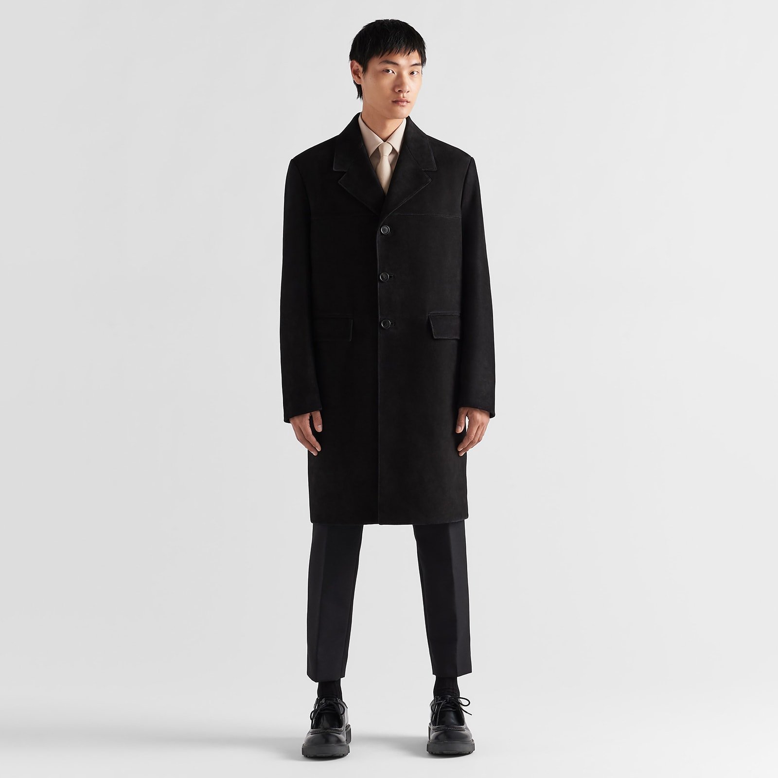 New volumes and silhouettes become archetypes in the Fall Water 2023 collection. Transformation is at the heart of the story, enhanced by a new aesthetic and textural approach. This coat evokes the idea of the uniform through an extremely sophisticated version. Behind the classic look of suede is outstanding artisan workmanship: buffing by hand and a final waxed finish that gives the garment an unexpected look.
