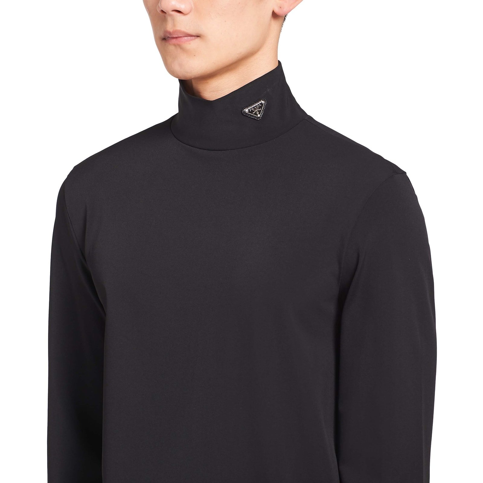 Emblematic of Prada since 1913, the enameled metal triangle logo decorates the turtleneck of this technical jersey sweater that blends classic minimalist allure with a sporty mood.