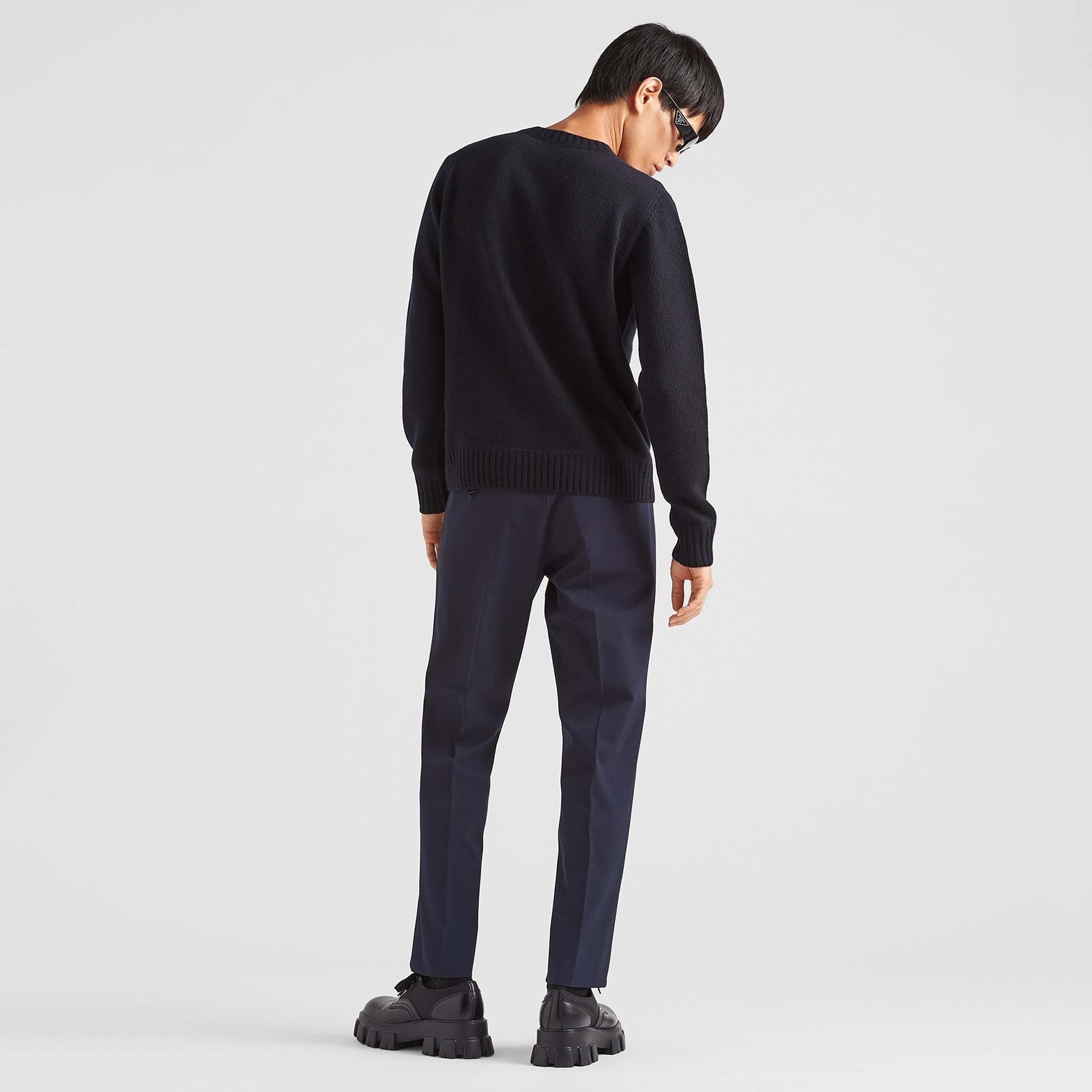 These stretch technical-fabric pants reinterpret a classic allure with a modern flair, thanks to their tailored straight cut. This one-of-a-kind combination reflects the duality inherent to Prada collections.