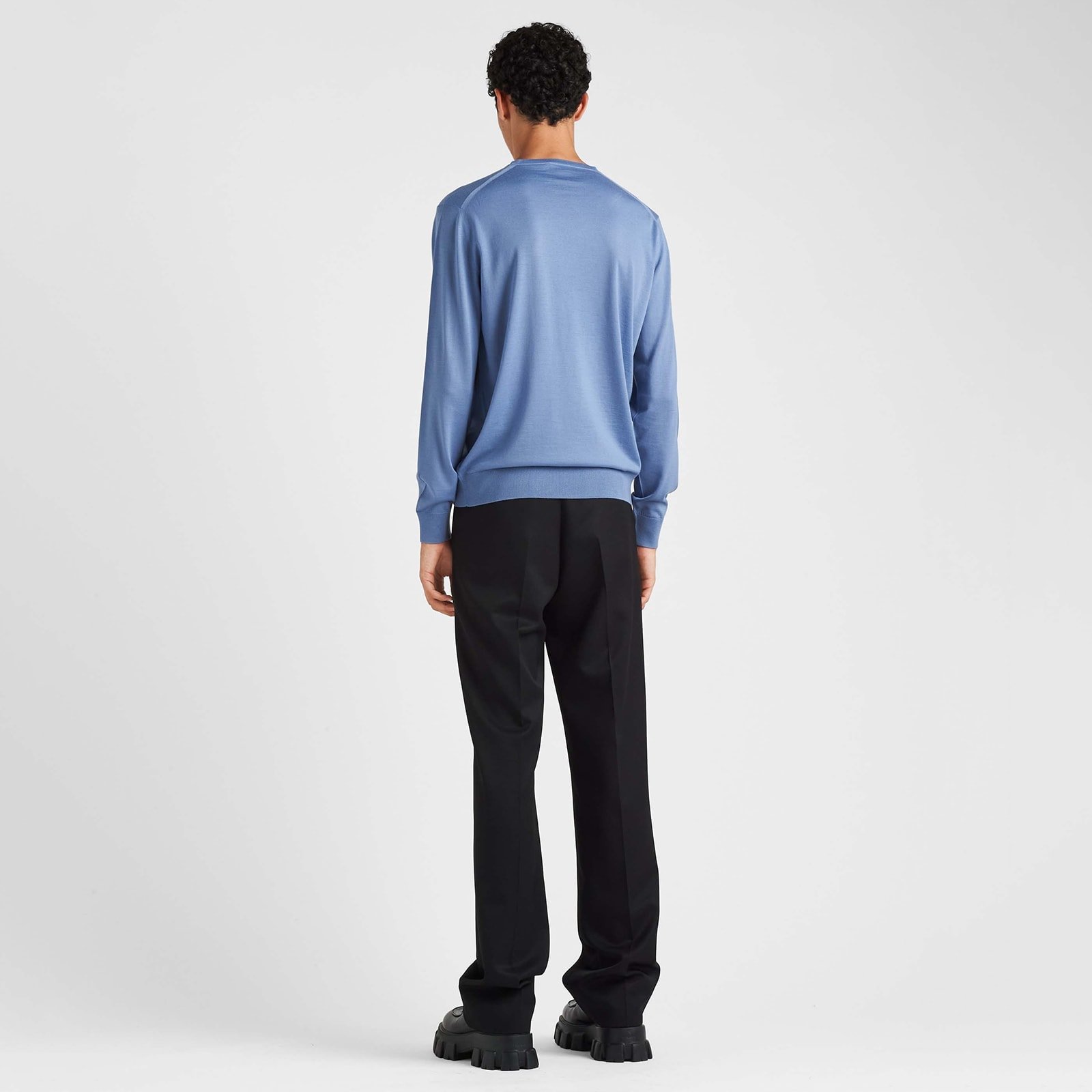 Luxurious materials and sophisticated design are the strengths of this worsted wool crew-neck sweater, featured with rounded collar, long sleeves and rib-knit cuffs and hemline.
