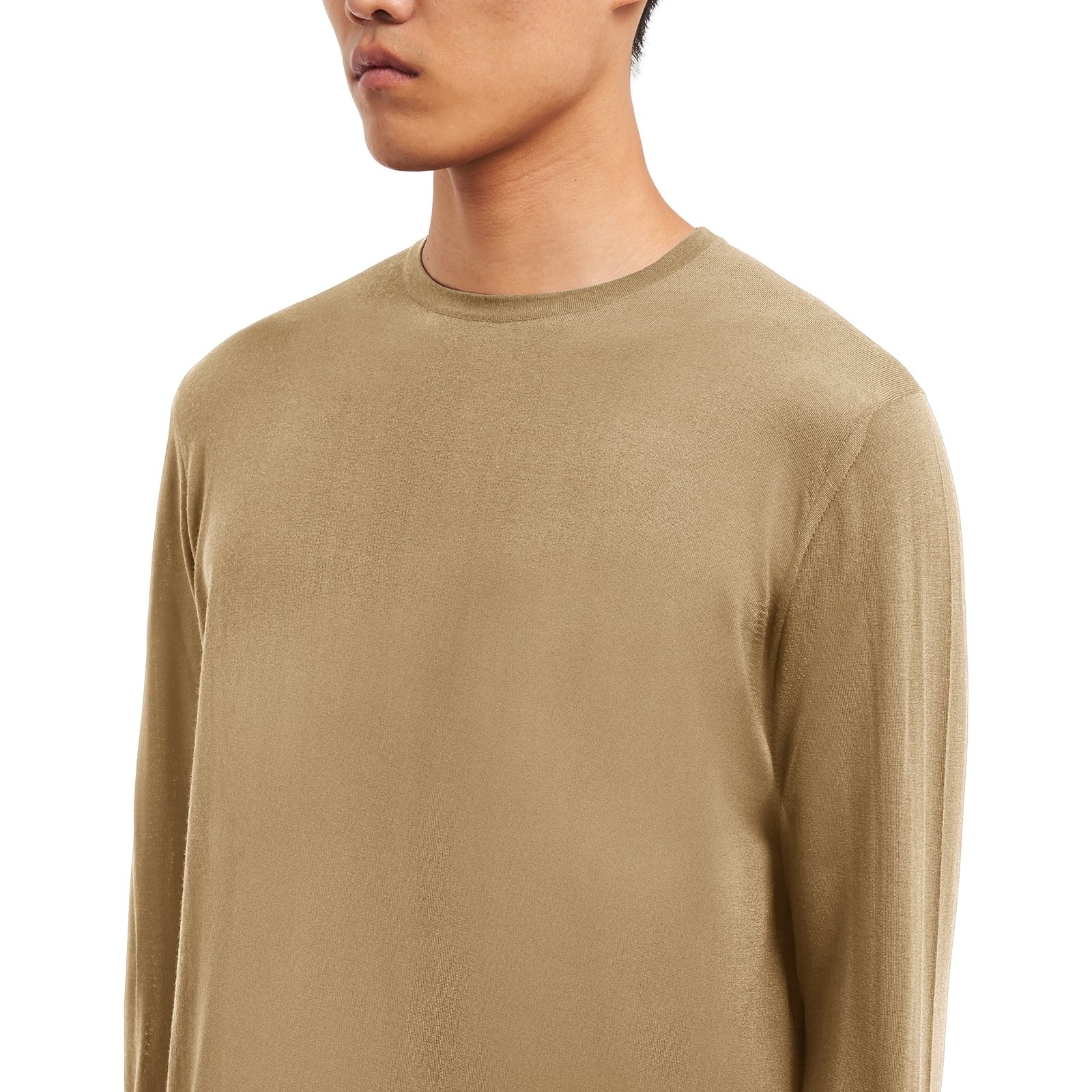 Luxurious materials and sophisticated design are the strengths of this worsted wool crew-neck sweater, featured with rounded collar, long sleeves and rib-knit cuffs and hemline.