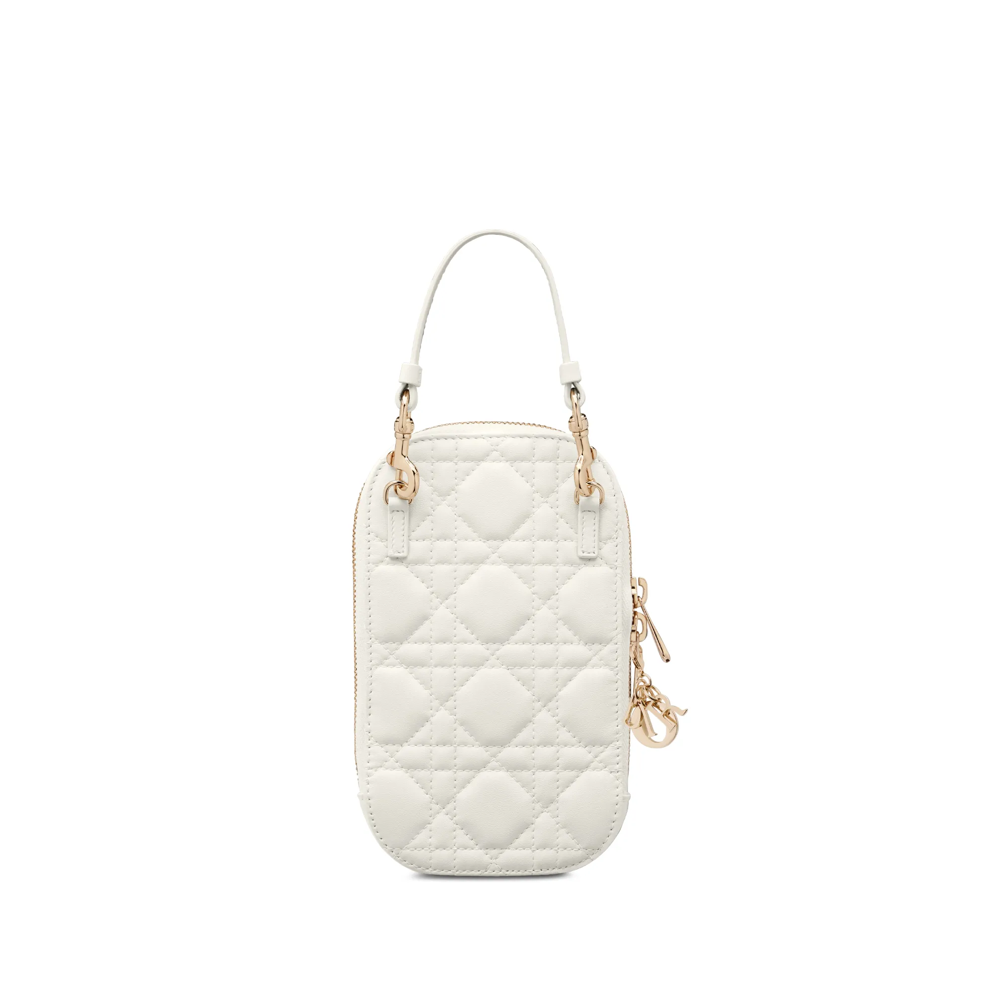 The Lady Dior Call’in Dior phone holder is both sophisticated and ingenious. Crafted in latte Cannage lambskin, the accessory features detachable D.I.O.R. charms. The phone holder may be carried by hand or worn crossbody thanks to its removable handle and chain strap.