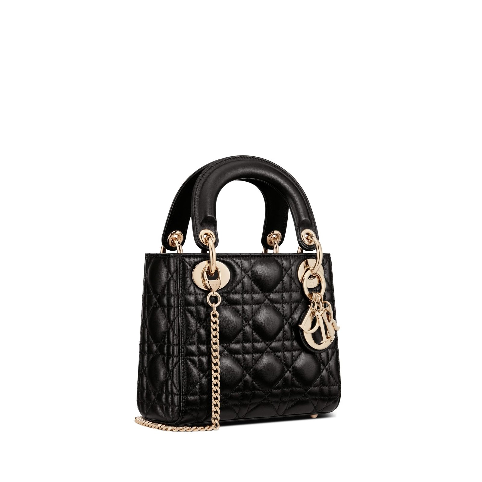 The Lady Dior bag epitomizes the House’s vision of elegance and beauty. Refined and sleek, the timeless creation is crafted in black lambskin and covered with Cannage stitching, creating an instantly recognizable quilted texture. The pale gold-finish metal D.I.O.R. charms embellish and illuminate its silhouette. Featuring a removable chain shoulder strap, the miniature Lady Dior bag can be carried by hand or worn crossbody as an ideal evening wear companion.