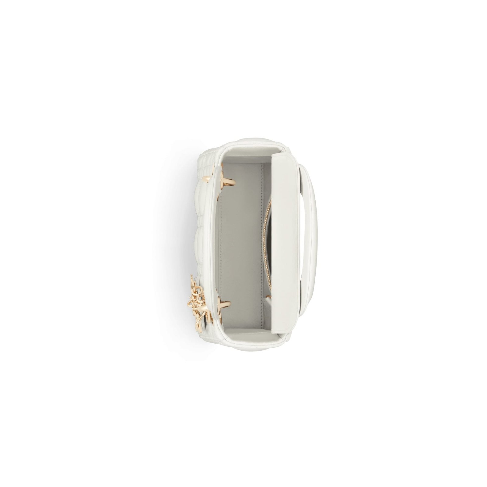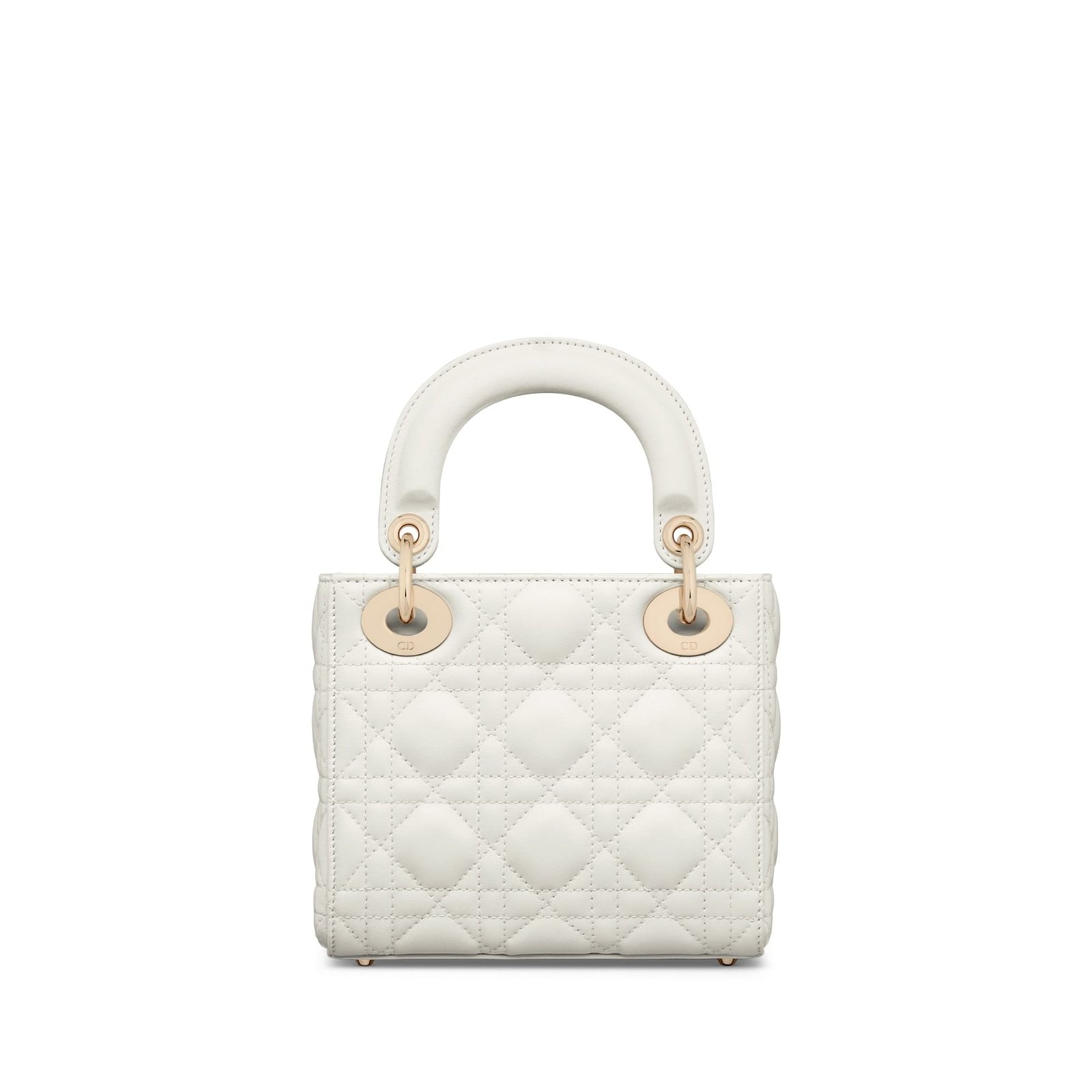 The Lady Dior bag epitomizes the House’s vision of elegance and beauty. Refined and sleek, the timeless creation is crafted in latte lambskin and covered with Cannage stitching, creating an instantly recognizable quilted texture. The pale gold-finish metal D.I.O.R. charms embellish and illuminate its silhouette. Featuring a removable chain shoulder strap, the miniature Lady Dior bag can be carried by hand or worn crossbody as an ideal evening wear companion.