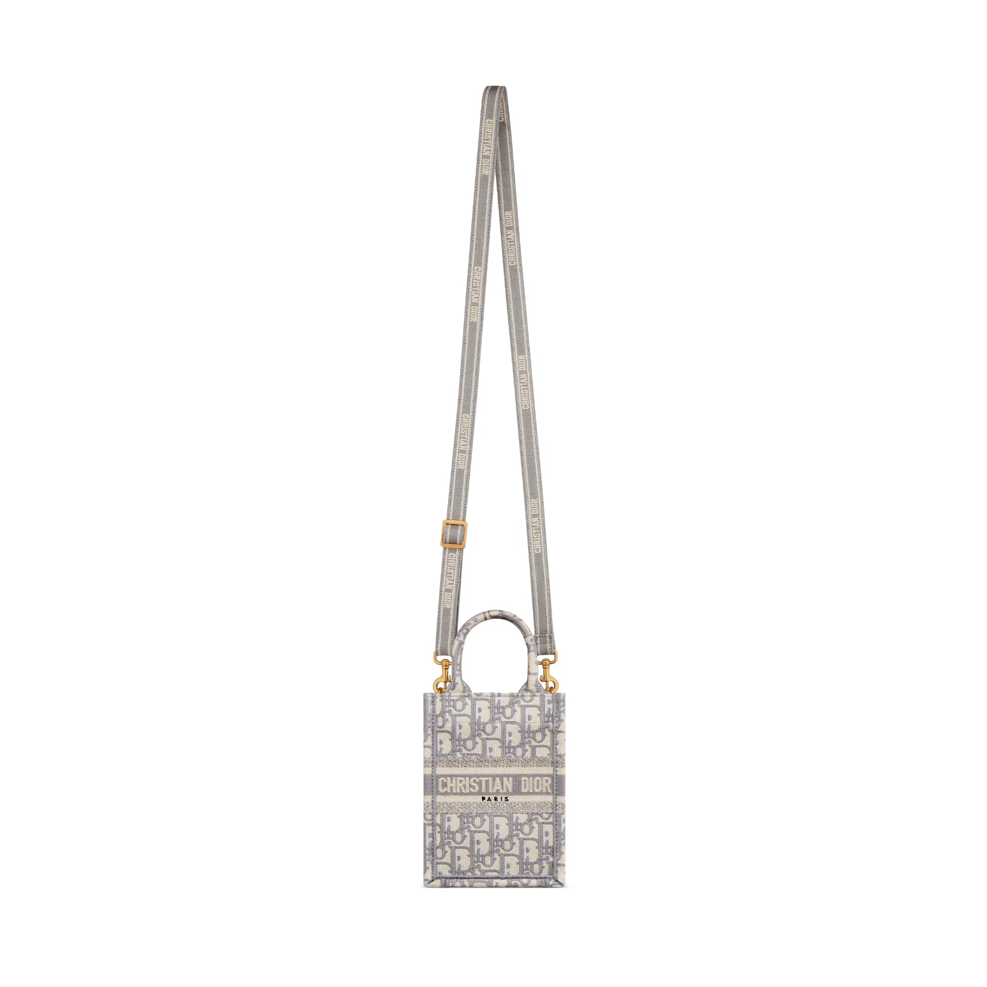 The Dior Book Tote is a House classic and original design by Maria Grazia Chiuri, Creative Director of Christian Dior. Exemplifying Dior’s savoir-faire, the vertical style is fully embroidered with the gray Dior Oblique motif and embellished with the Christian Dior Paris signature on the front. It can accommodate a phone as well as small daily essentials. Completed by an adjustable and removable embroidered strap, the miniature modern accessory can be carried by hand, worn over the shoulder or crossbody.