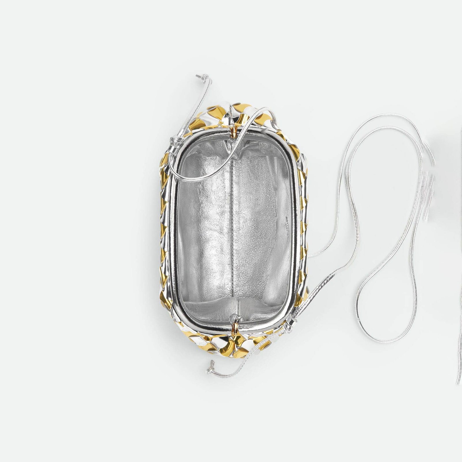 Mini Intrecciato lamina leather clutch with strap and wavy bicolor Pavimento effect